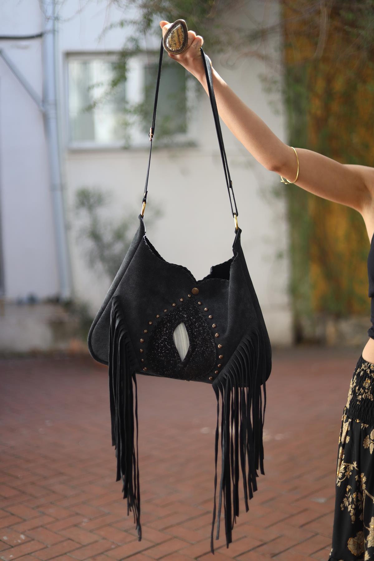 Anthracite Natural Stone Detailed Tasseled Leather Bag