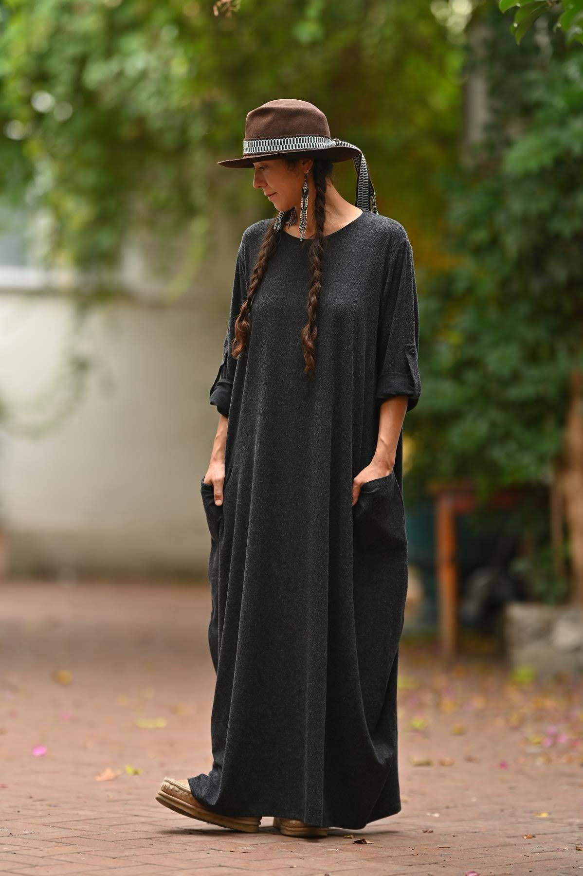 Antrasit Kırçıllı Uzun Kollu Triko Elbise