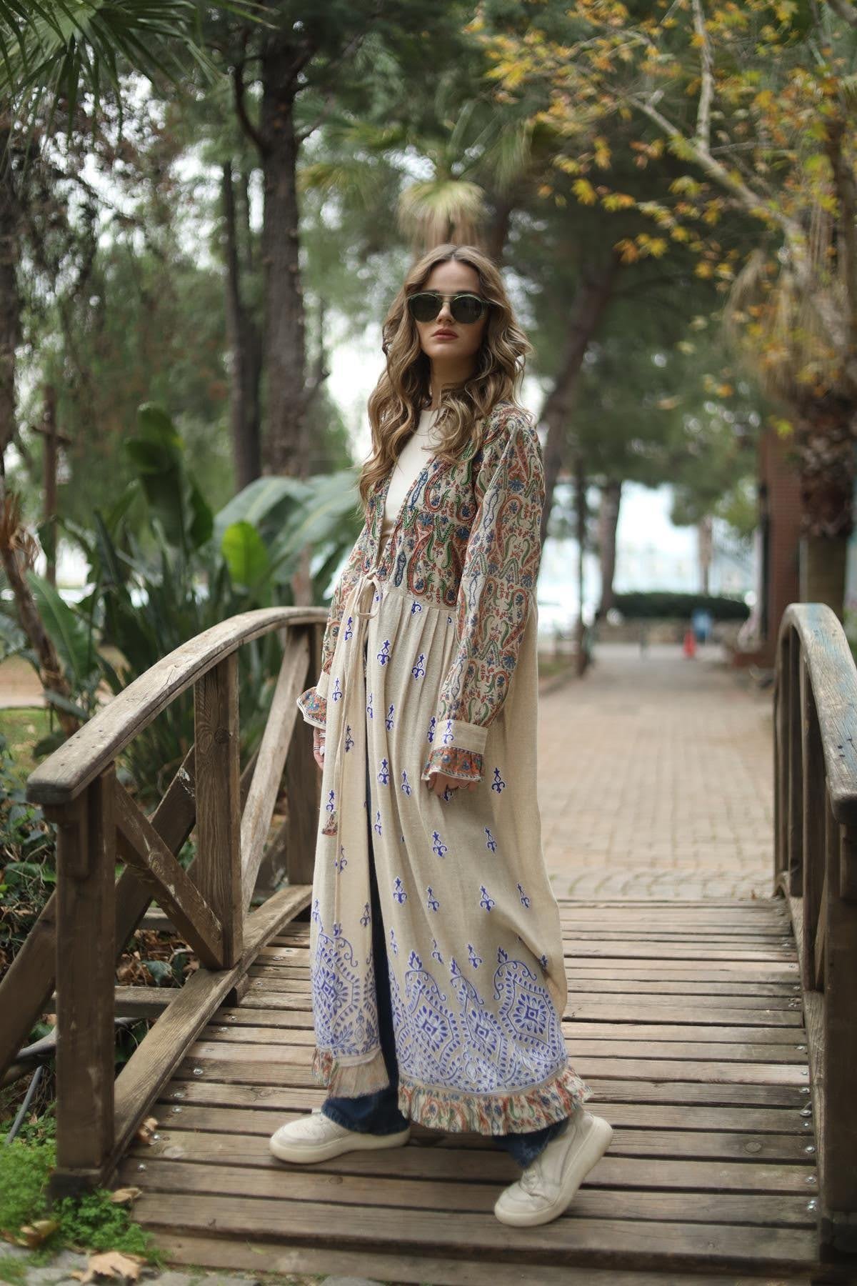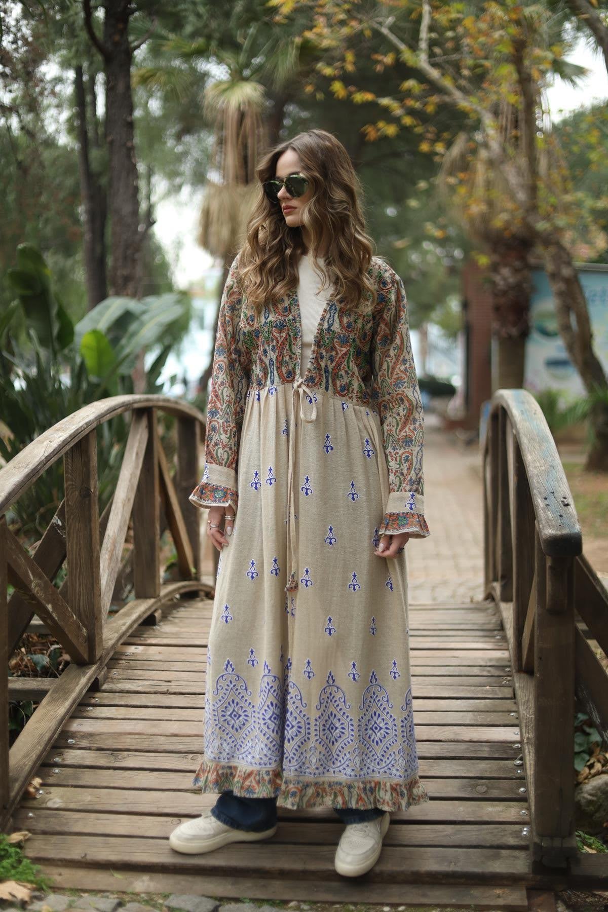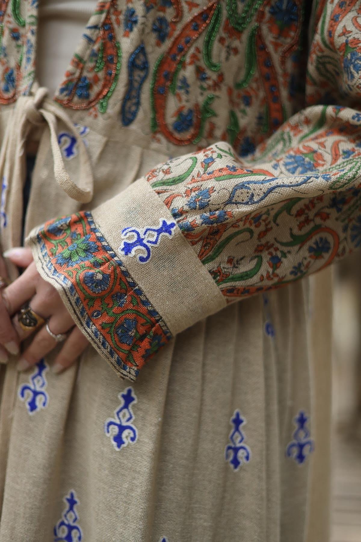 Beige Authentic Patterned Woven Caftan