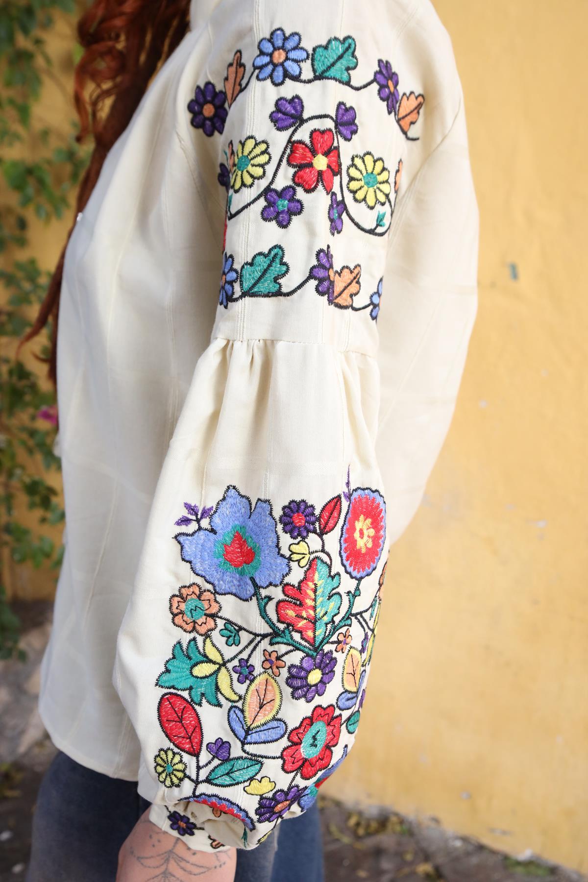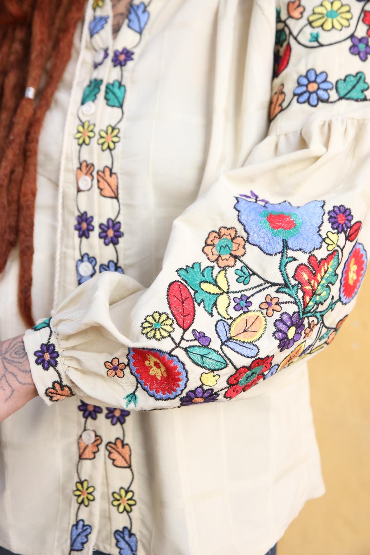 Beige Embroidery Bishop Sleeve Lace Up Collar Shirt (KG-ESQ-024-PA-BEJ1-S)