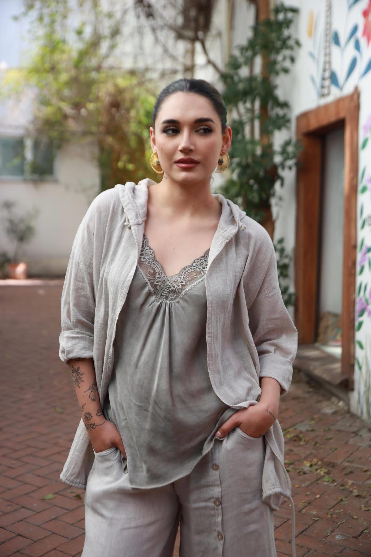 Beige Hooded Back Sequined Jacket