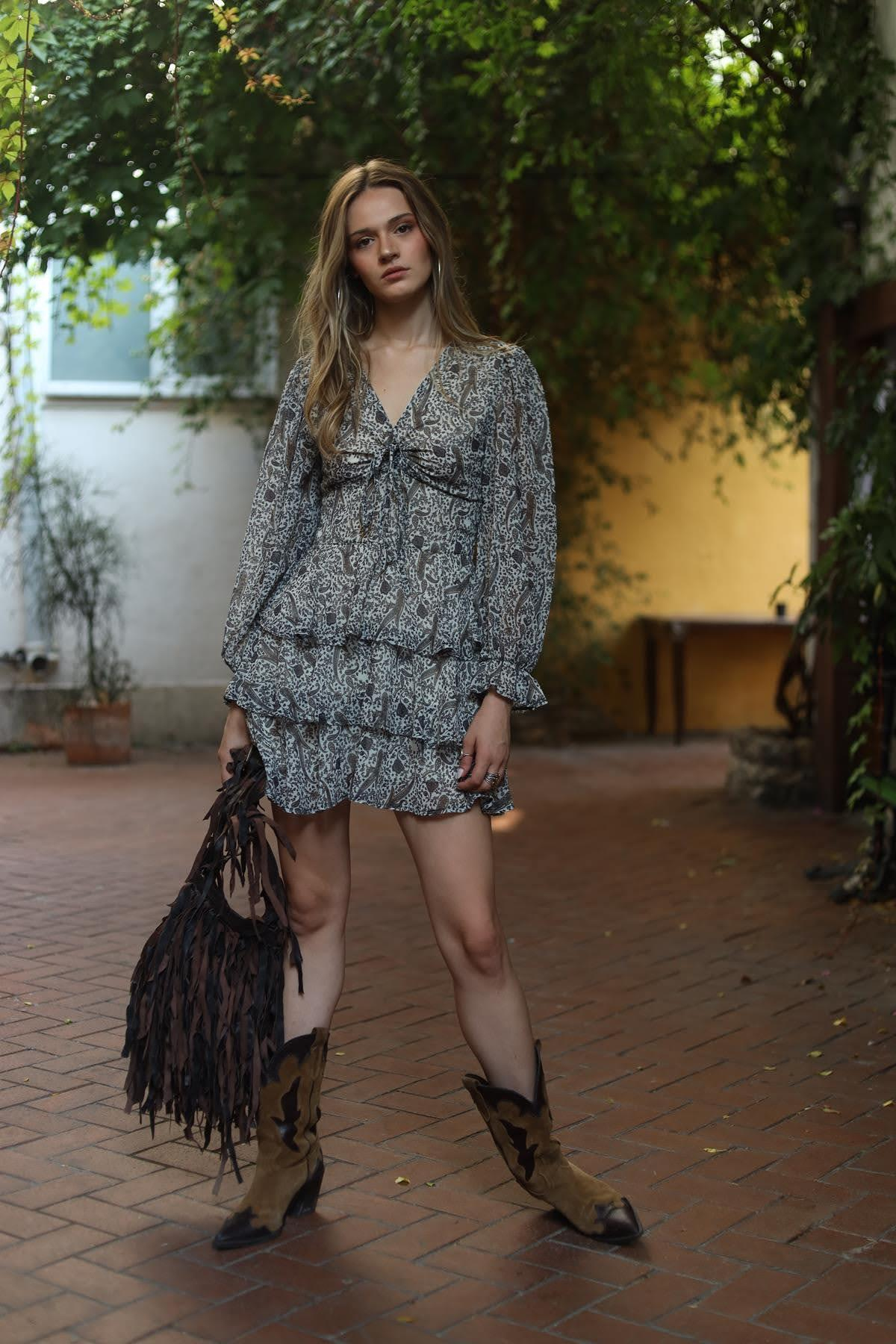 Bej V Yaka Önden Büzgülü Fırfırlı Elbise