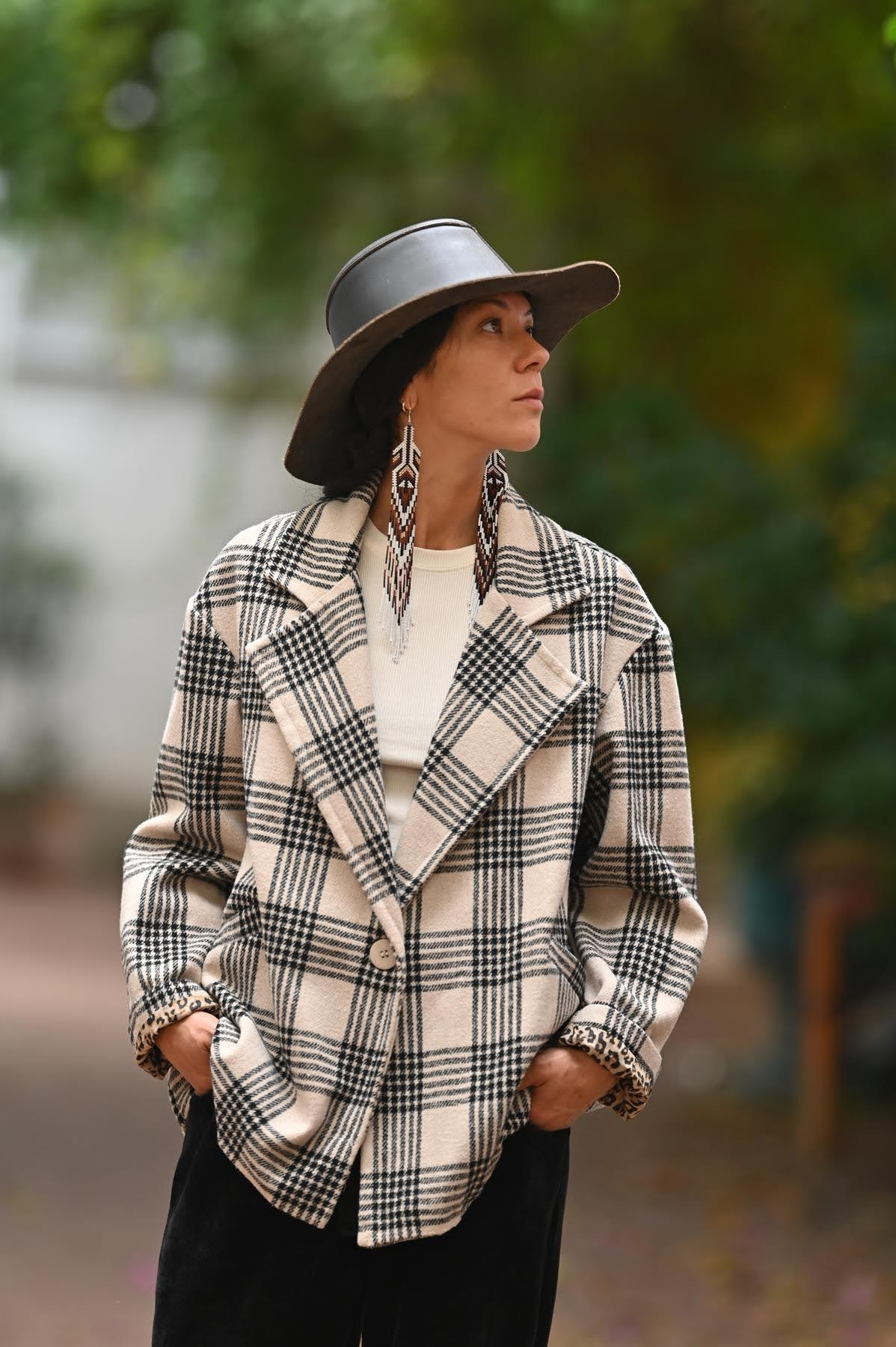 Bej Leopar Astarlı Ekose Keçe Ceket