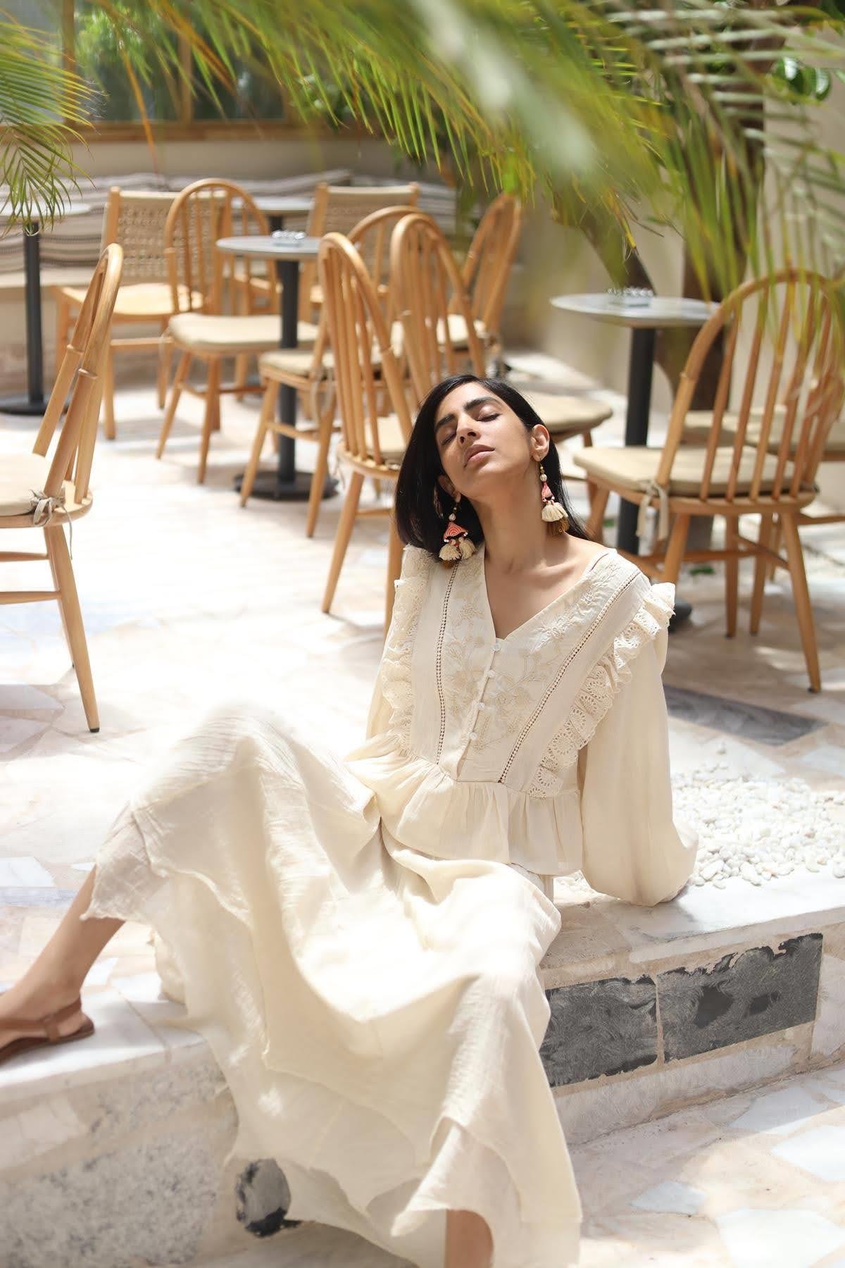 Bej V Yaka Düğmeli İşlemeli Güpürlü Bluz (KB-ESQ-050-PA-BEJ-S)