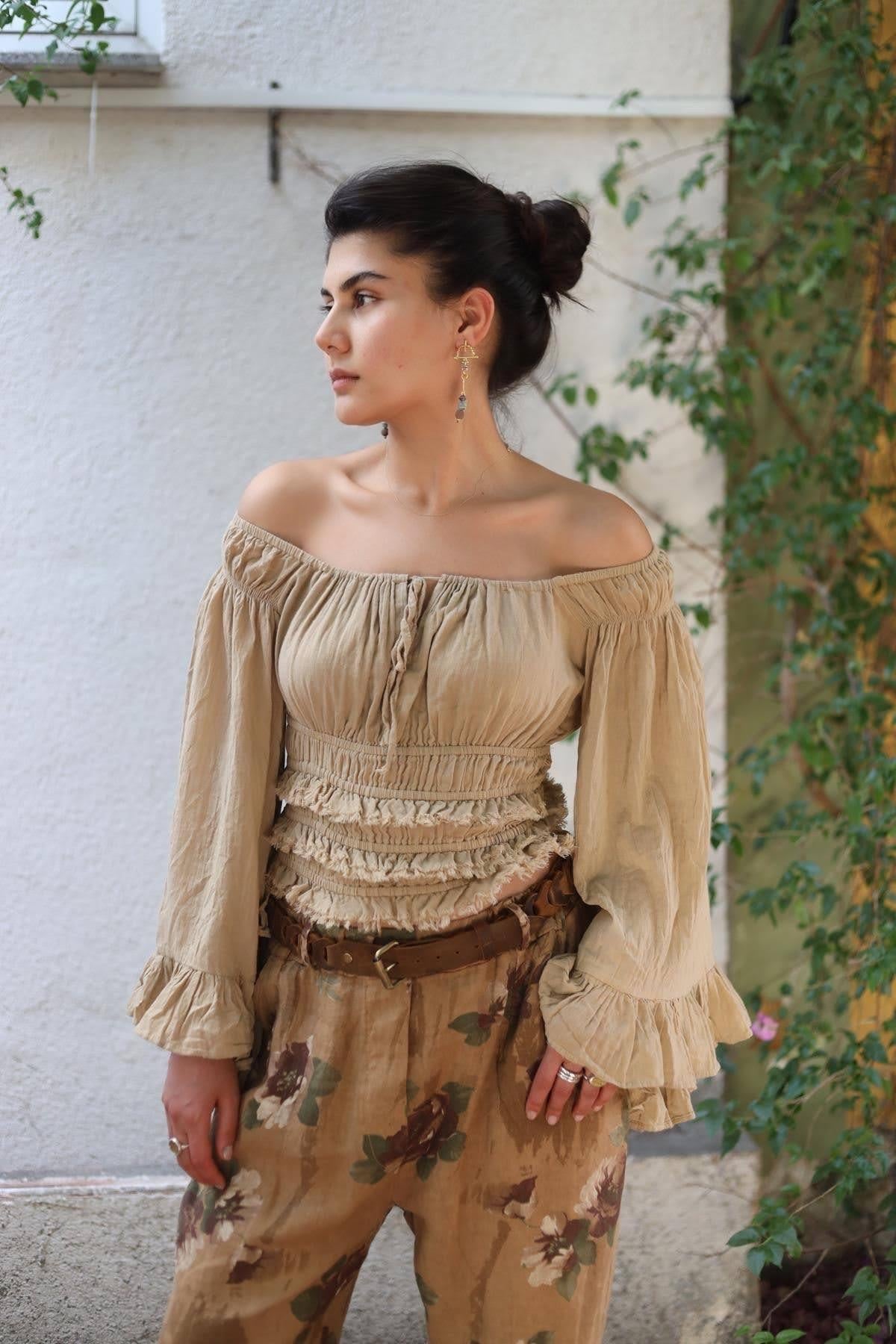 Bej Yakası Büzgülü Kolları Asimetrik Volanlı Bluz (KB-RMR-001-PA-BEJ-STD)
