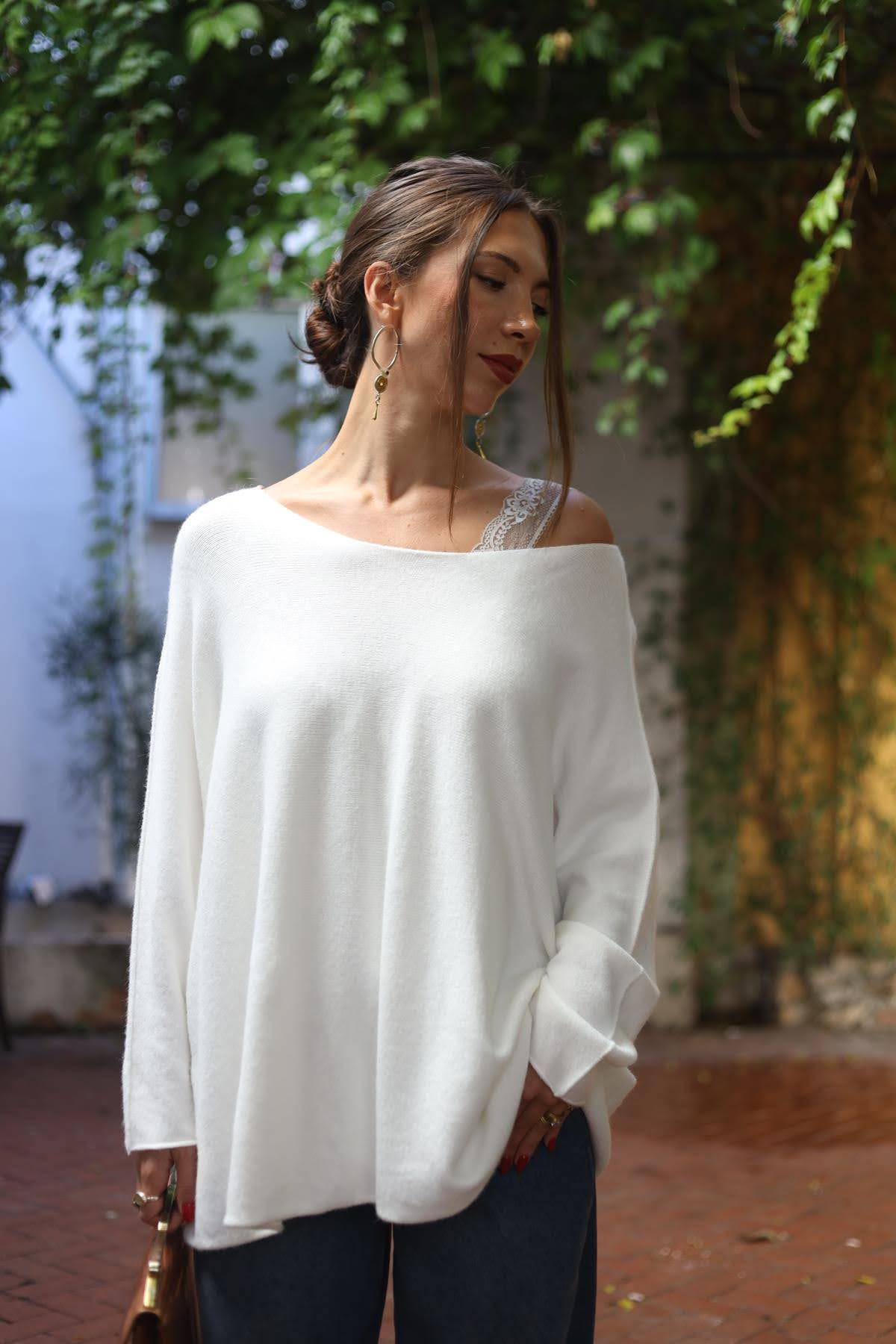 Beyaz Bisiklet Yaka Dikişsiz Bluz