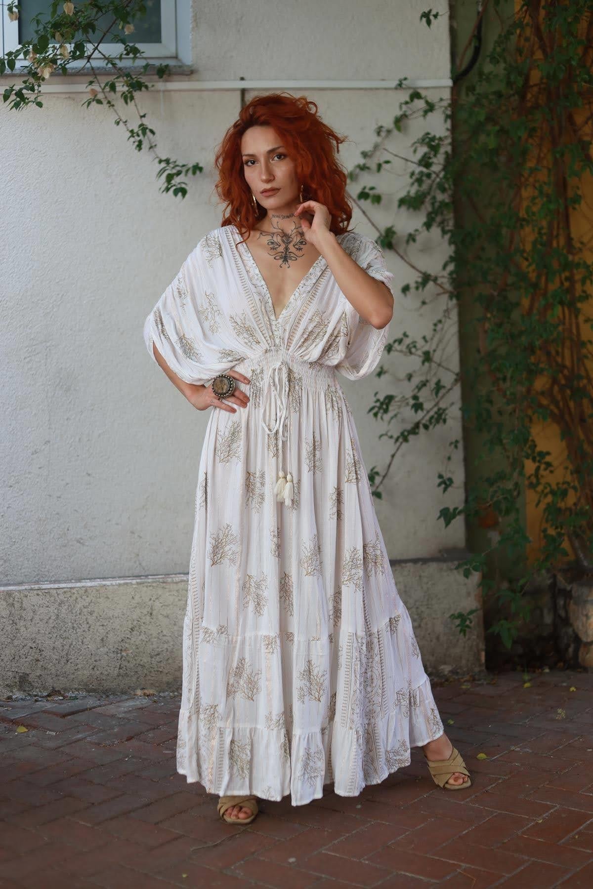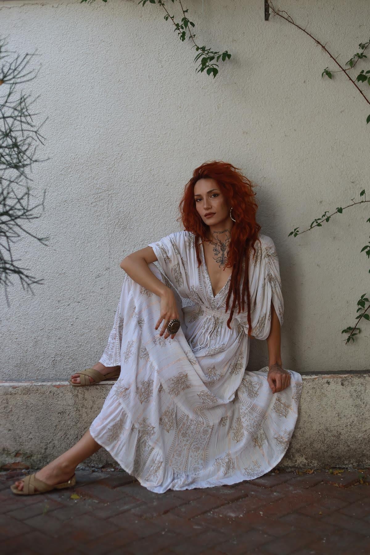 Beyaz Gold Detaylı Omzu Büzgülü Otantik Elbise (KE-RMR-077-VI-BE-STD)