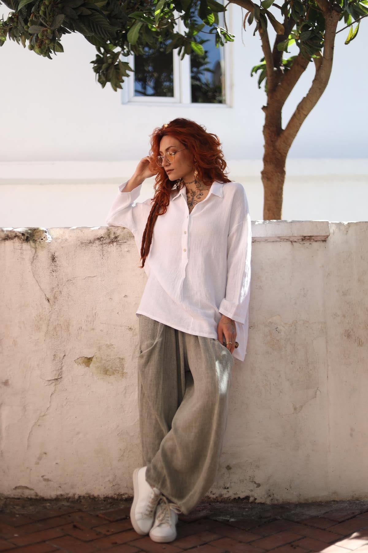Beyaz Gömlek Yaka Önü Pileli Keten Bluz