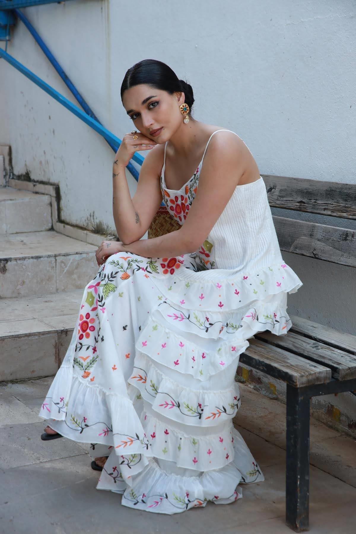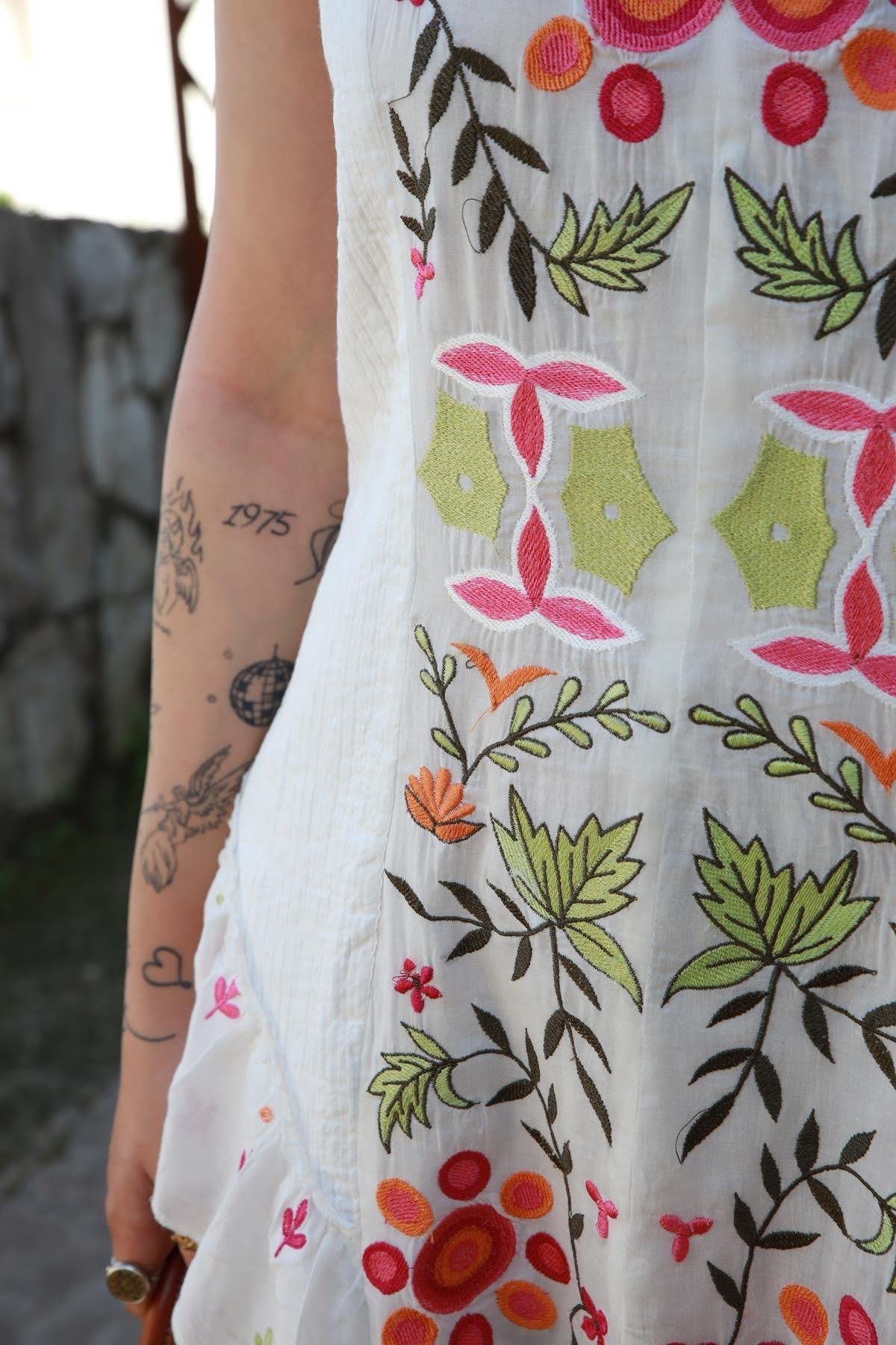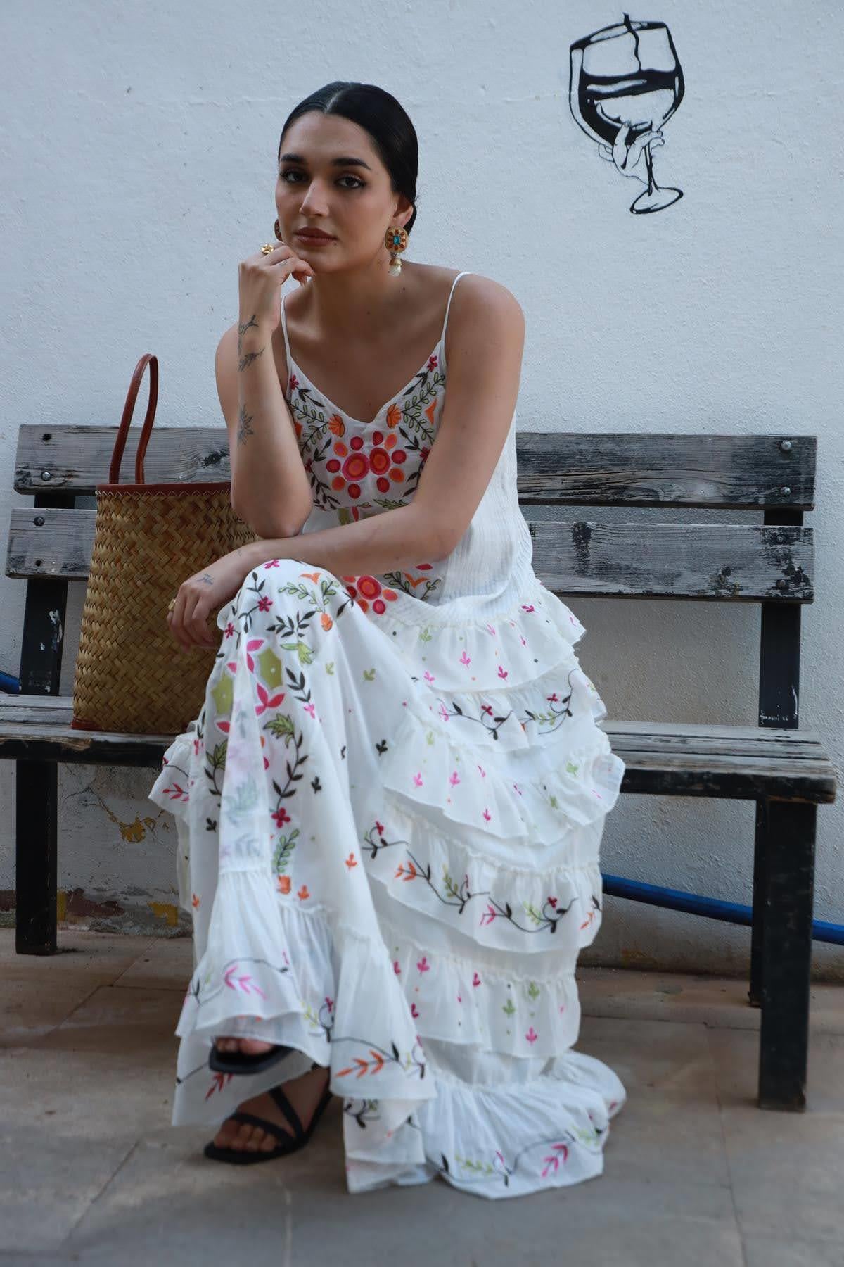 Beyaz İp Askılı Volanlı Otantik Nakışlı Elbise