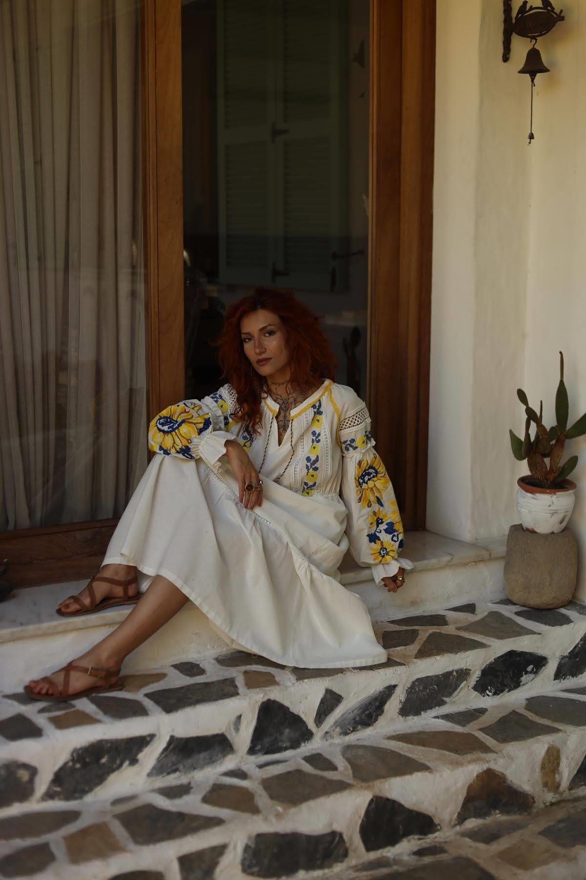 Beyaz Kanaviçe İşlemeli Dantel Detaylı Elbise