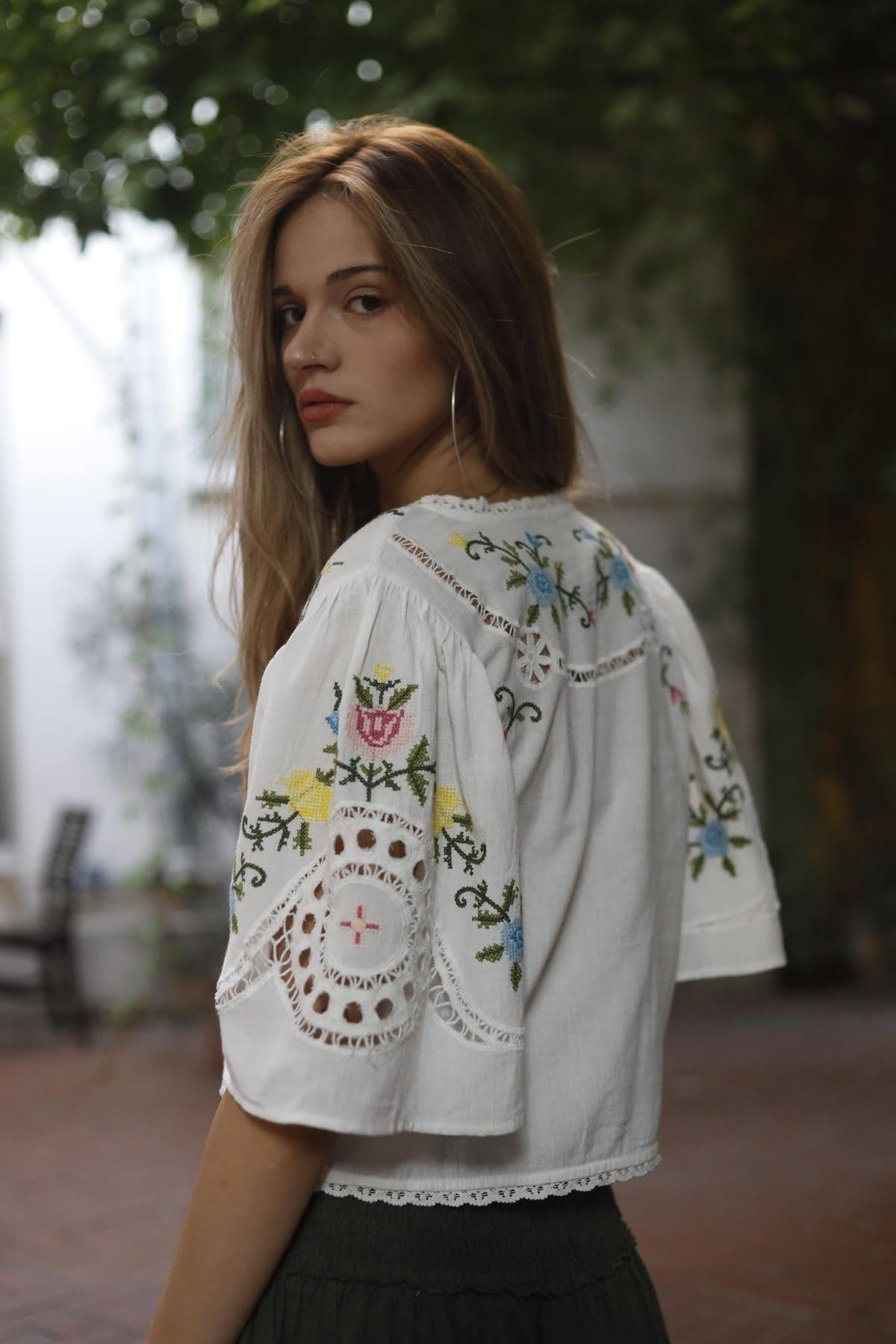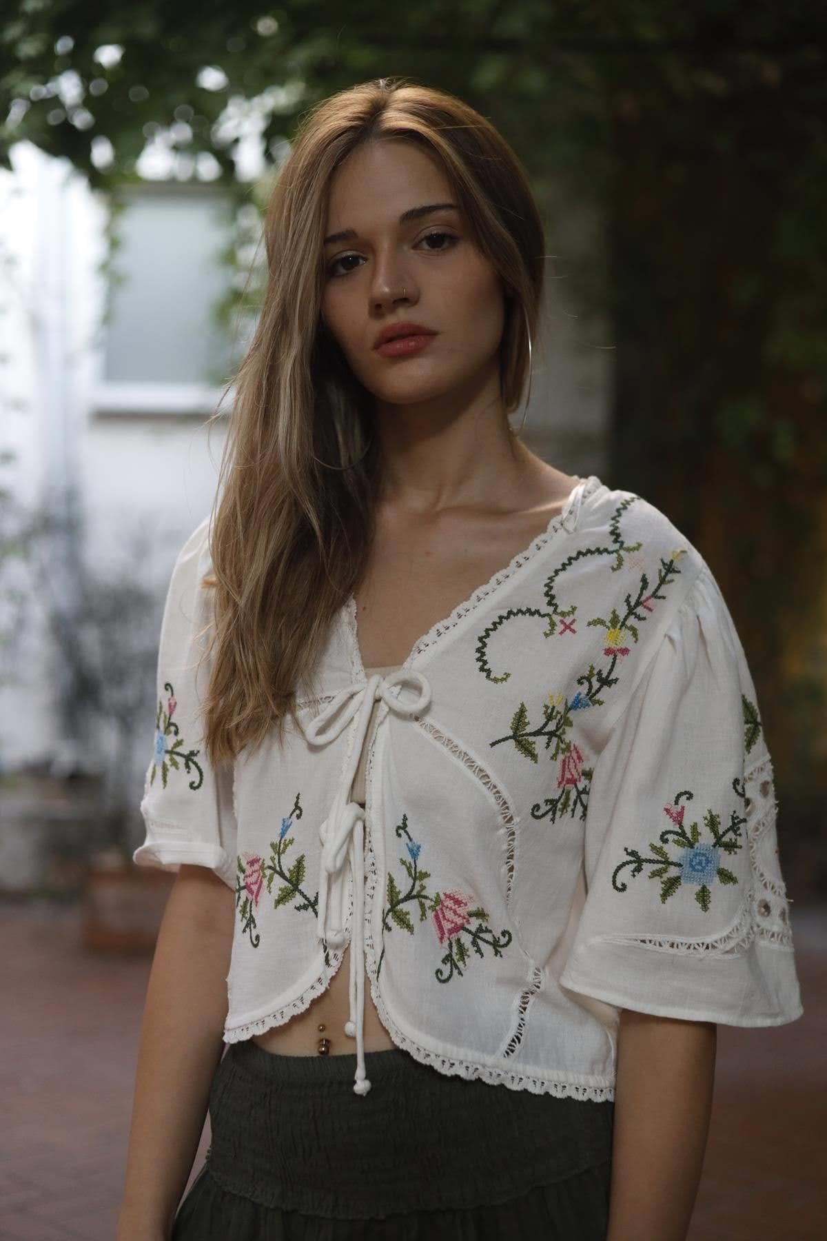 Beyaz Kanaviçe İşlemeli Dantel Detaylı Kısa Ceket