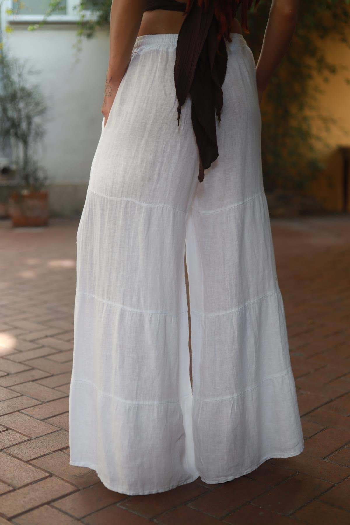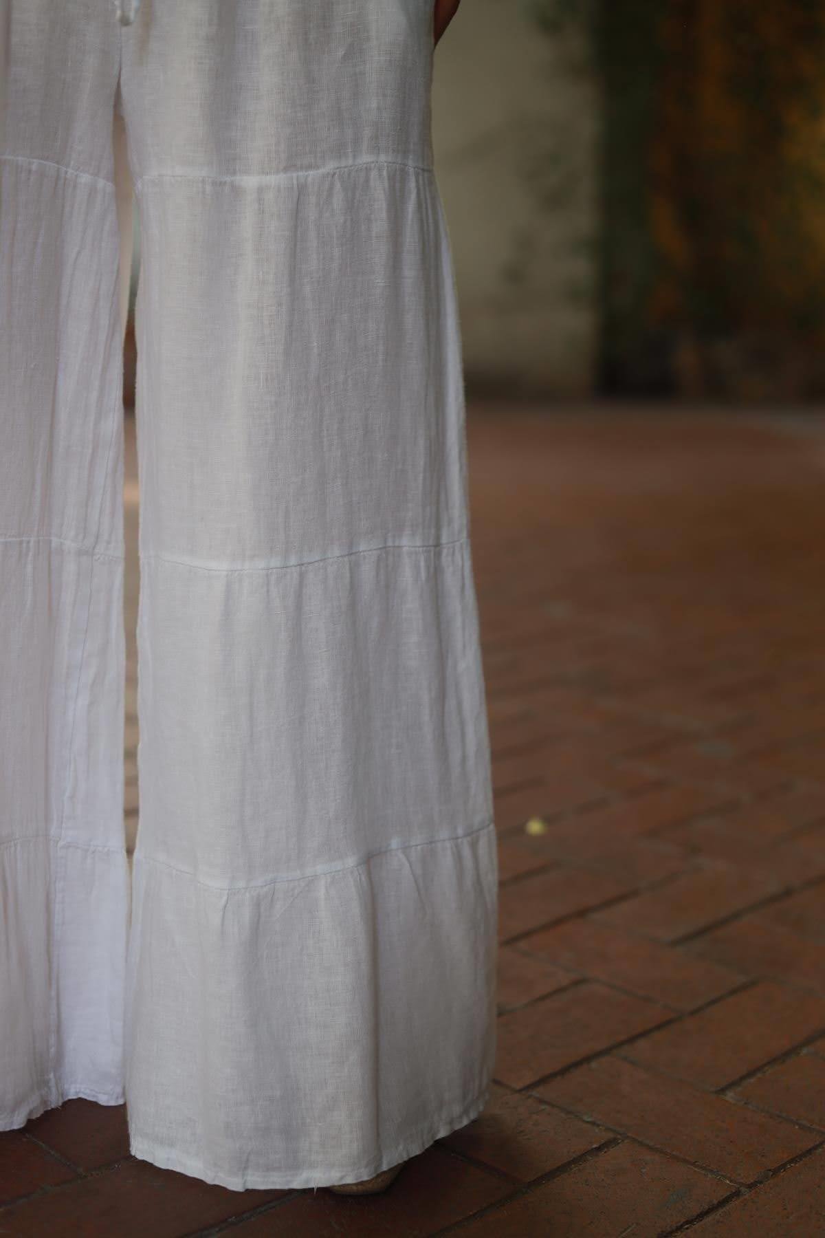 Beyaz Kat Kat Dikiş Detaylı Keten Pantolon