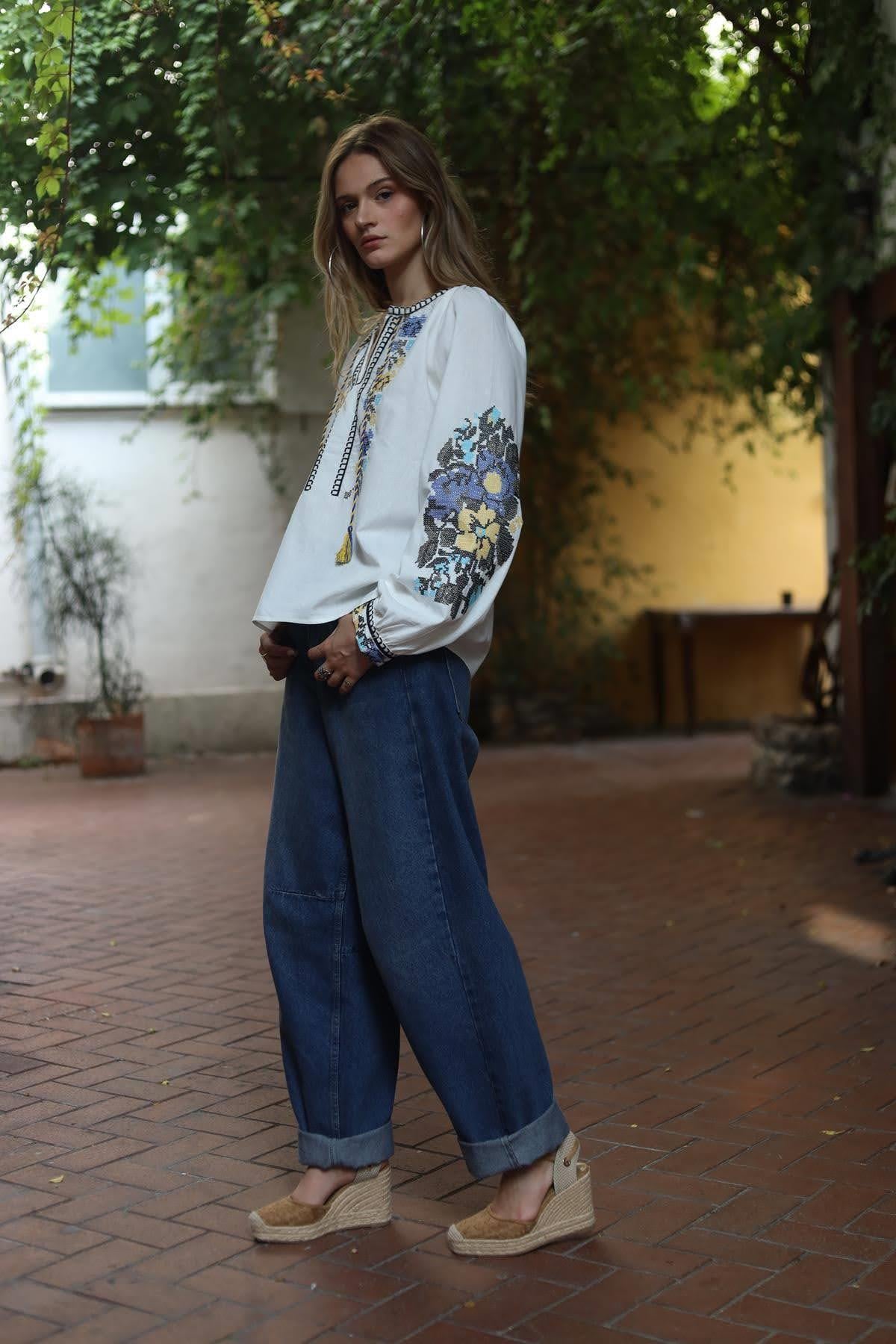 Beyaz Kesik Yaka Püsküllü Kanaviçe İşlemeli Bluz - Şaman Butik Beyaz Kesik Yaka Püsküllü Kanaviçe İşlemeli Bluz