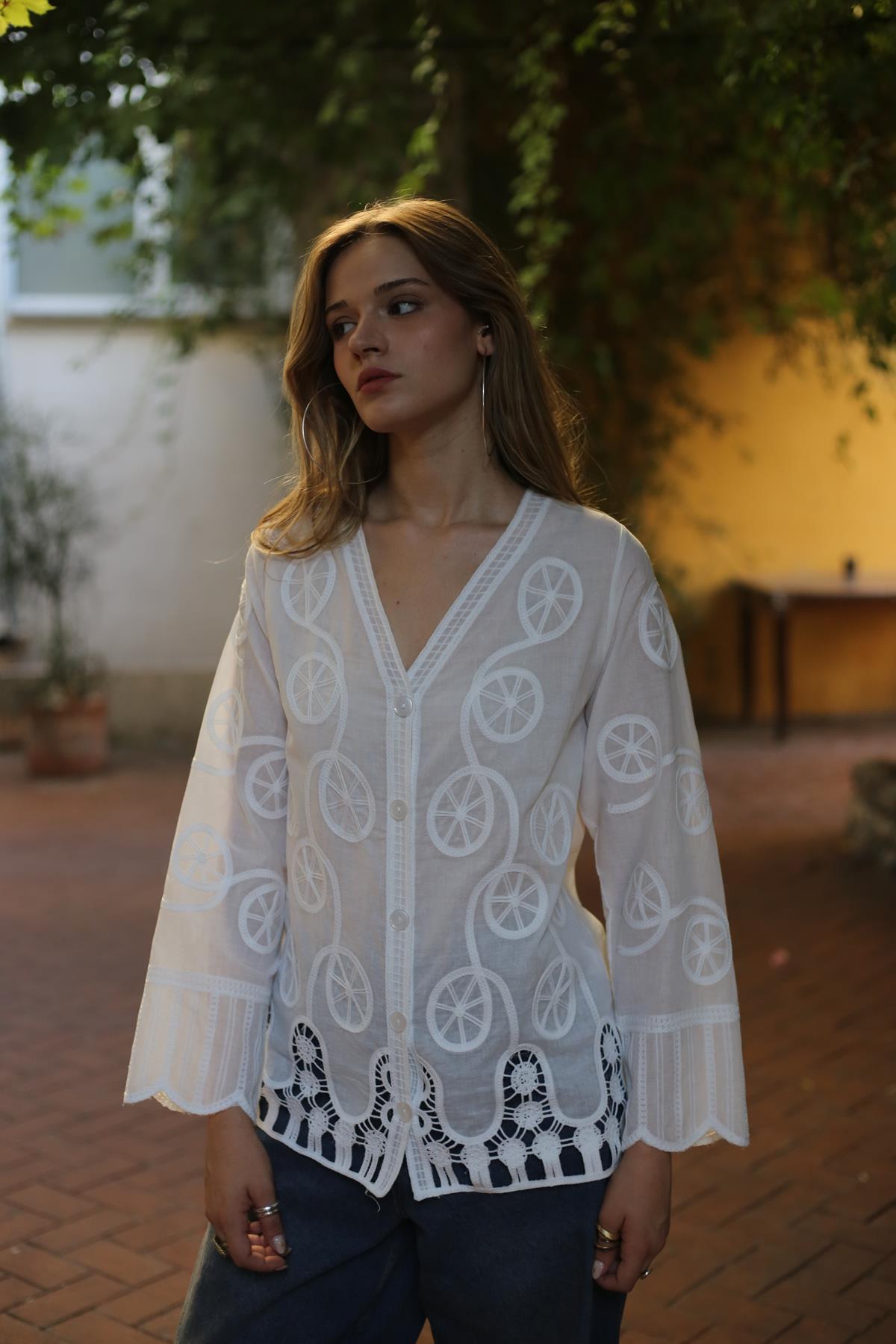 Beyaz Otantik Nakışlı Ajurlu Gömlek
