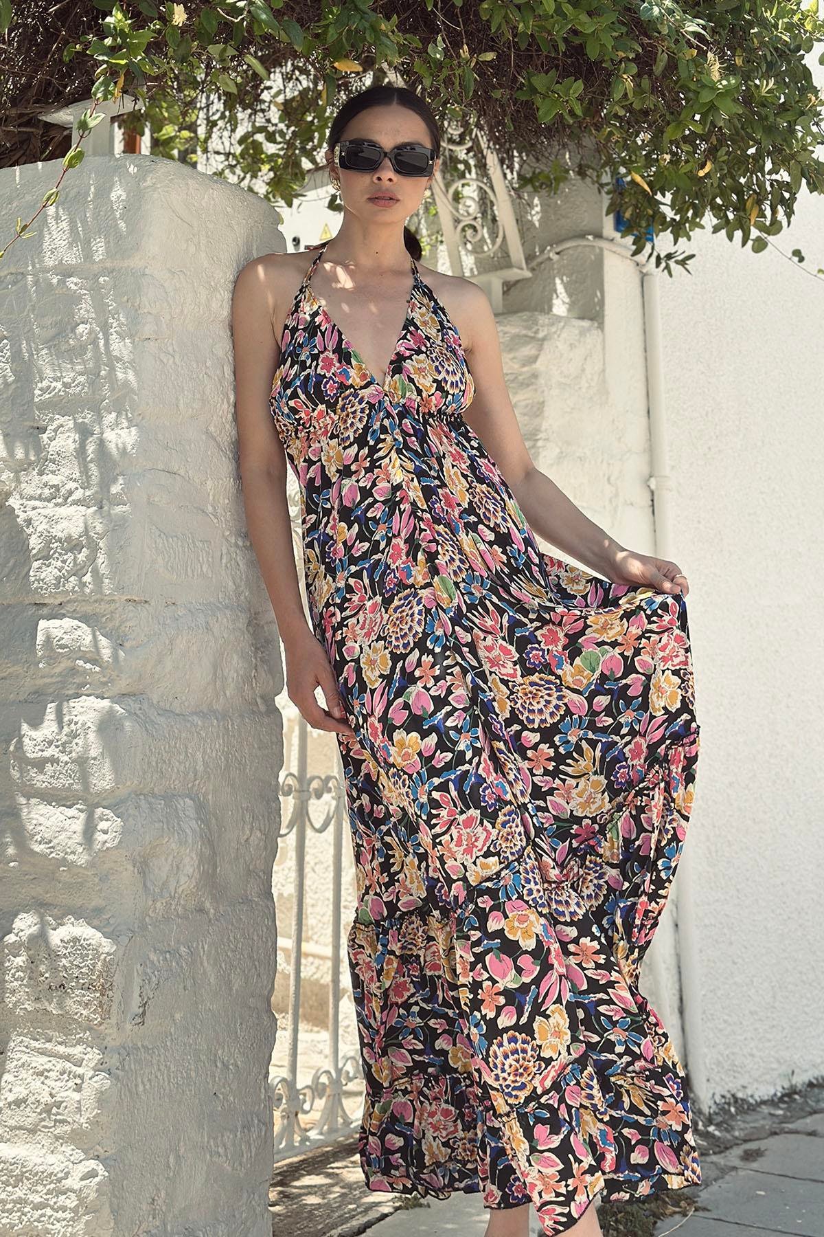 Black Patterned Backless Silk Dress