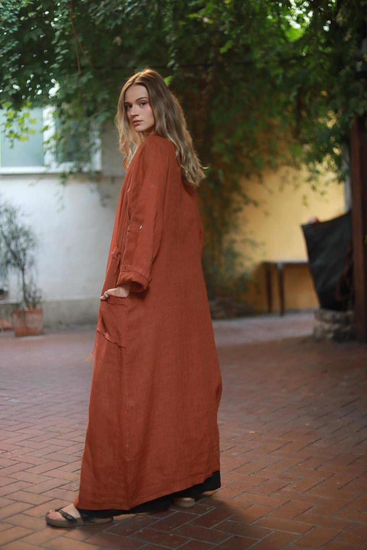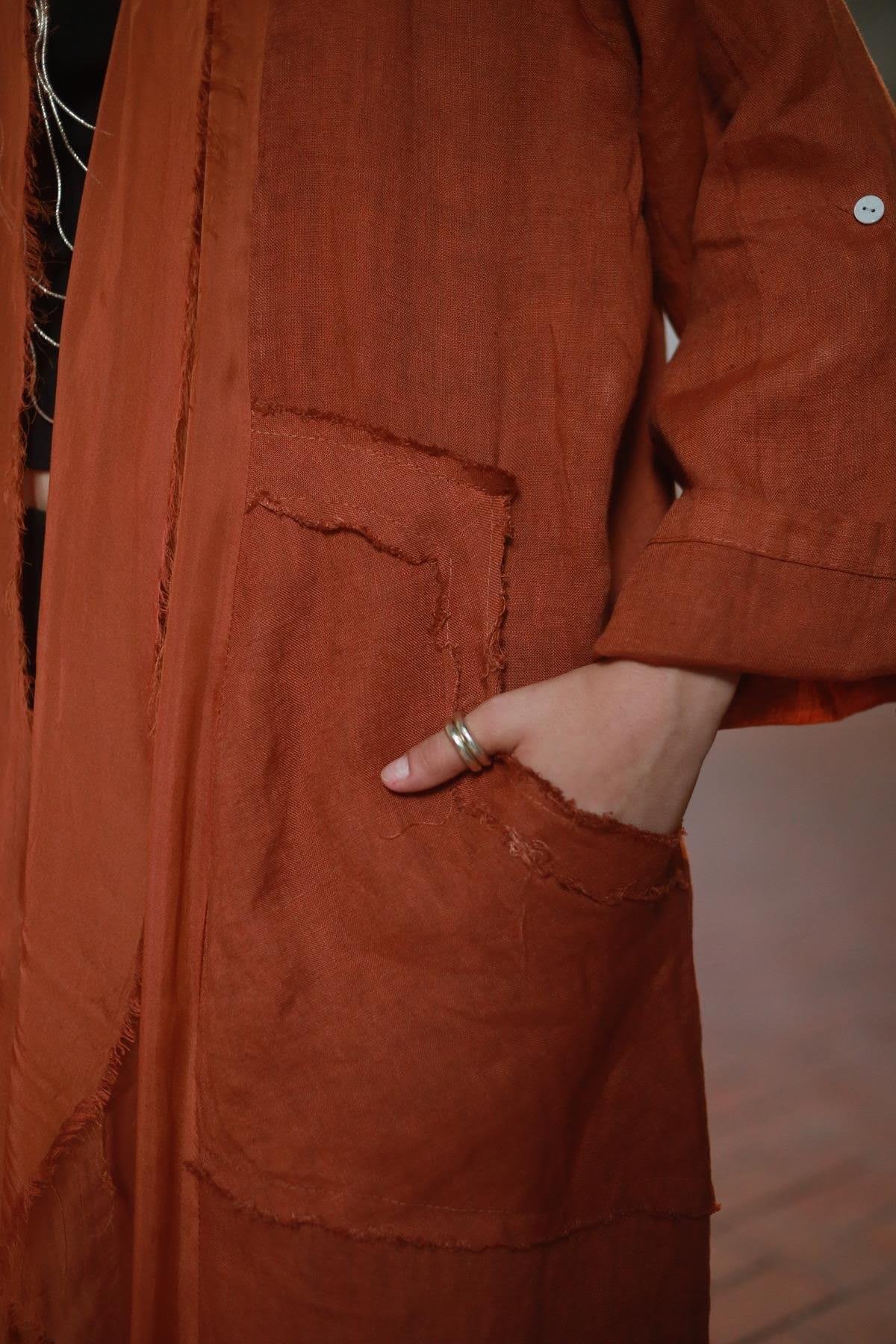 Brick Color Fringed Linen Caftan