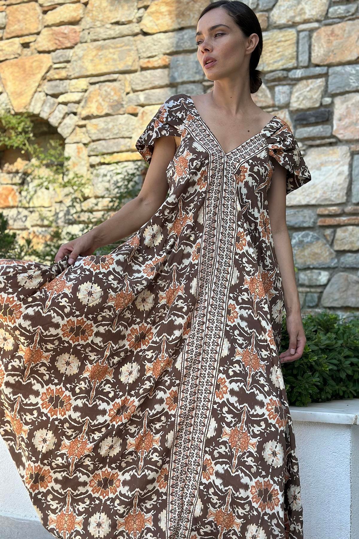 Brown Patterned V Neck Strappy Dress (KE-ERK-012-IP-KA-STD)