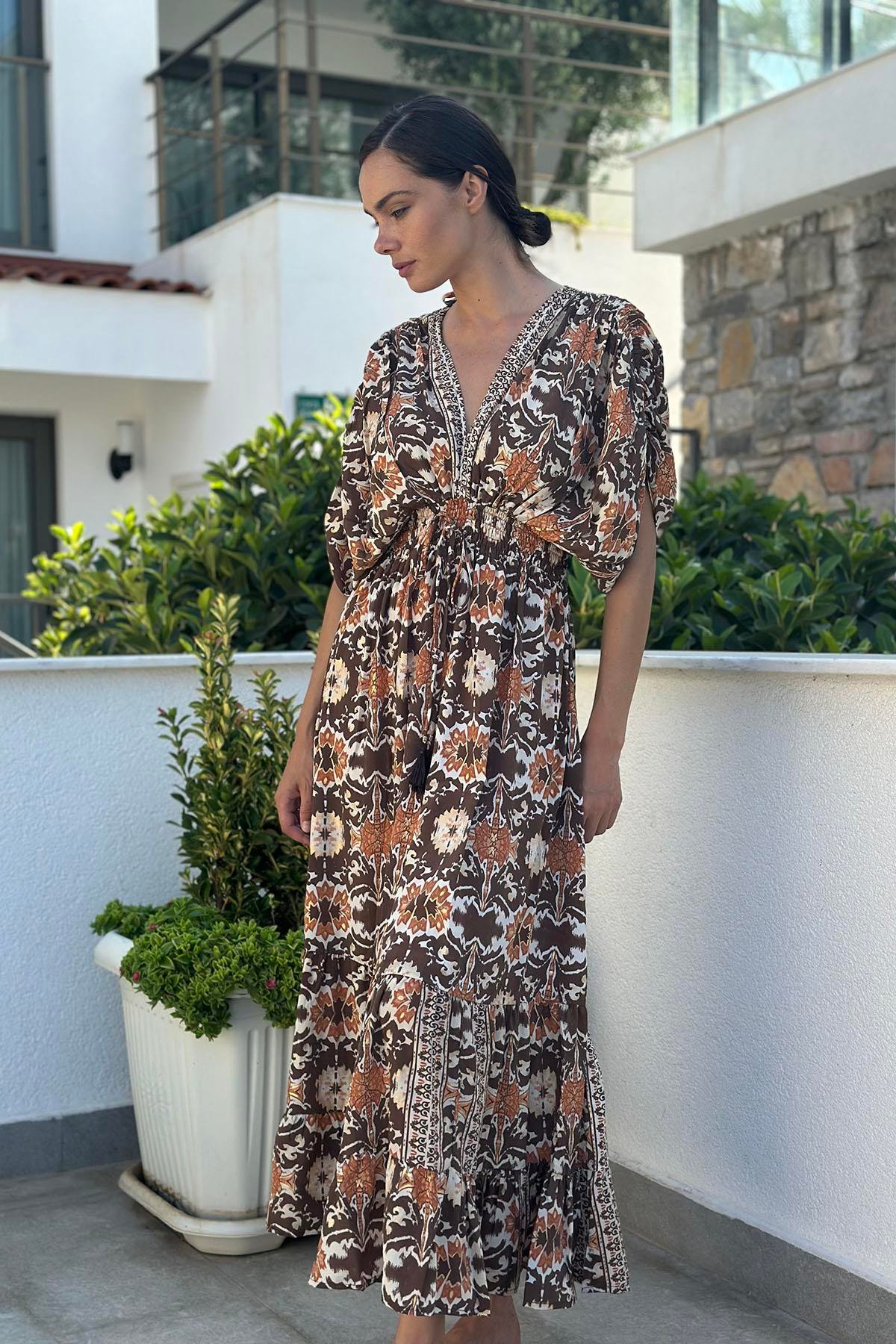 Brown Shoulder Detailed Authentic Silk Dress