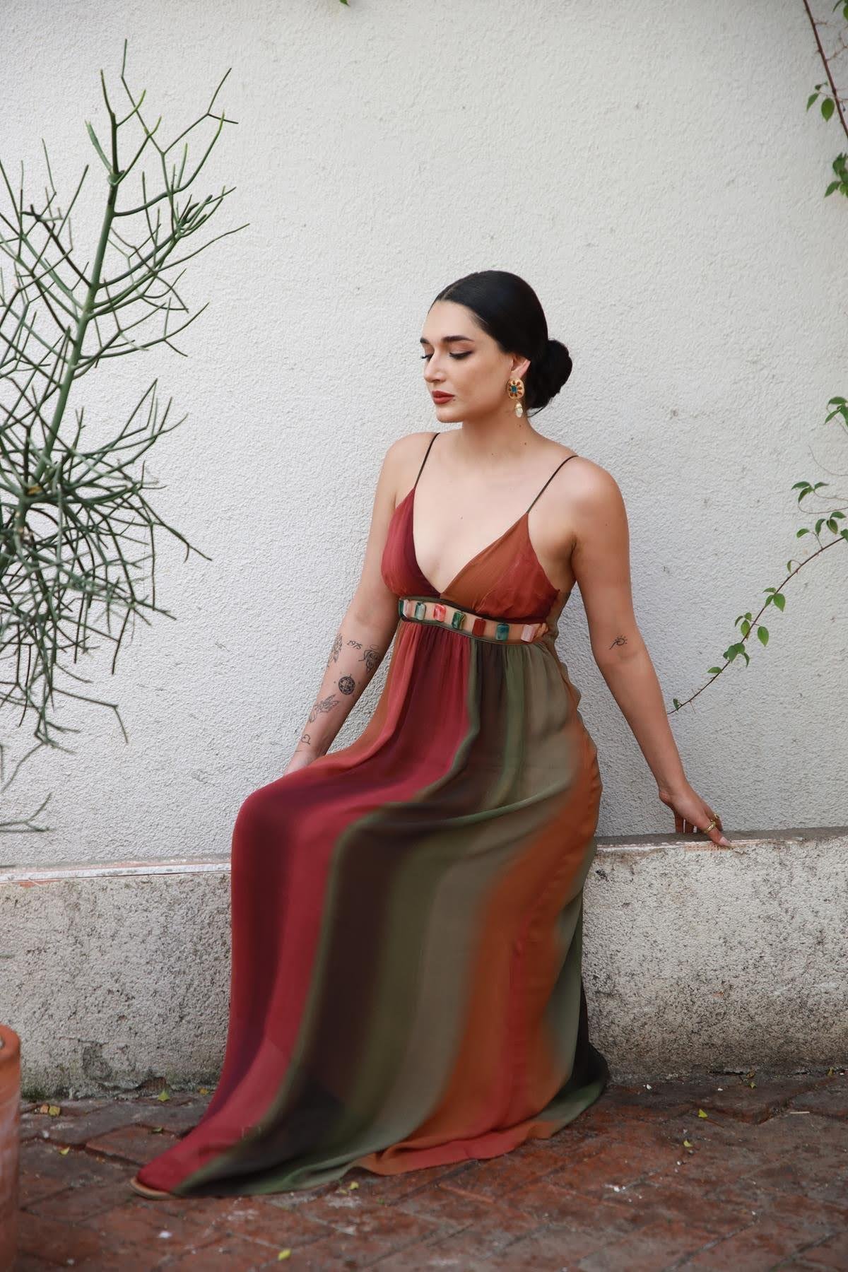 Burgundy Colored Stone Detailed Chiffon Dress