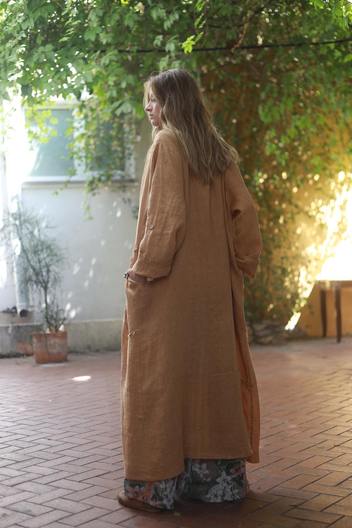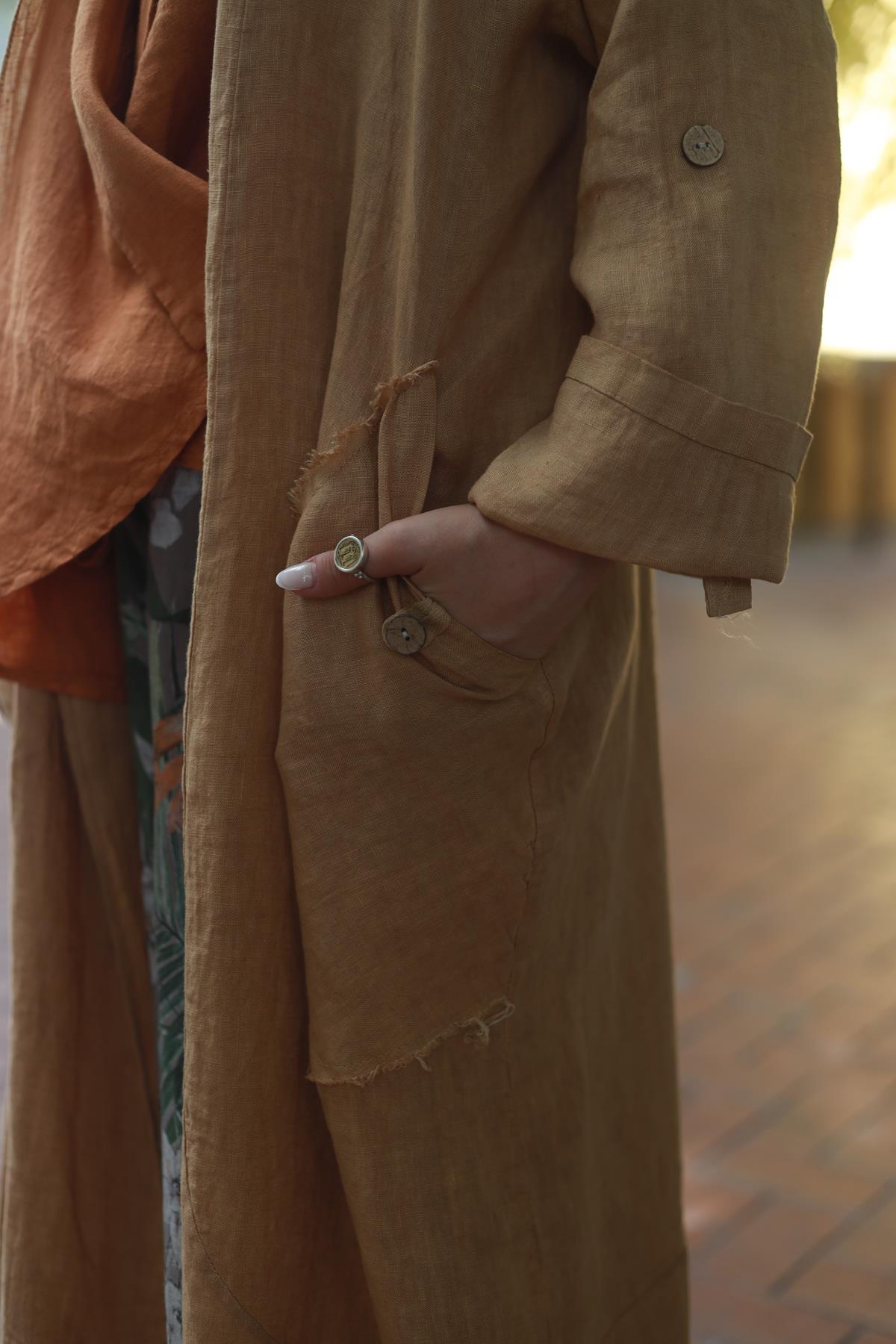 Camel Color Buttoned Pocket Linen Caftan