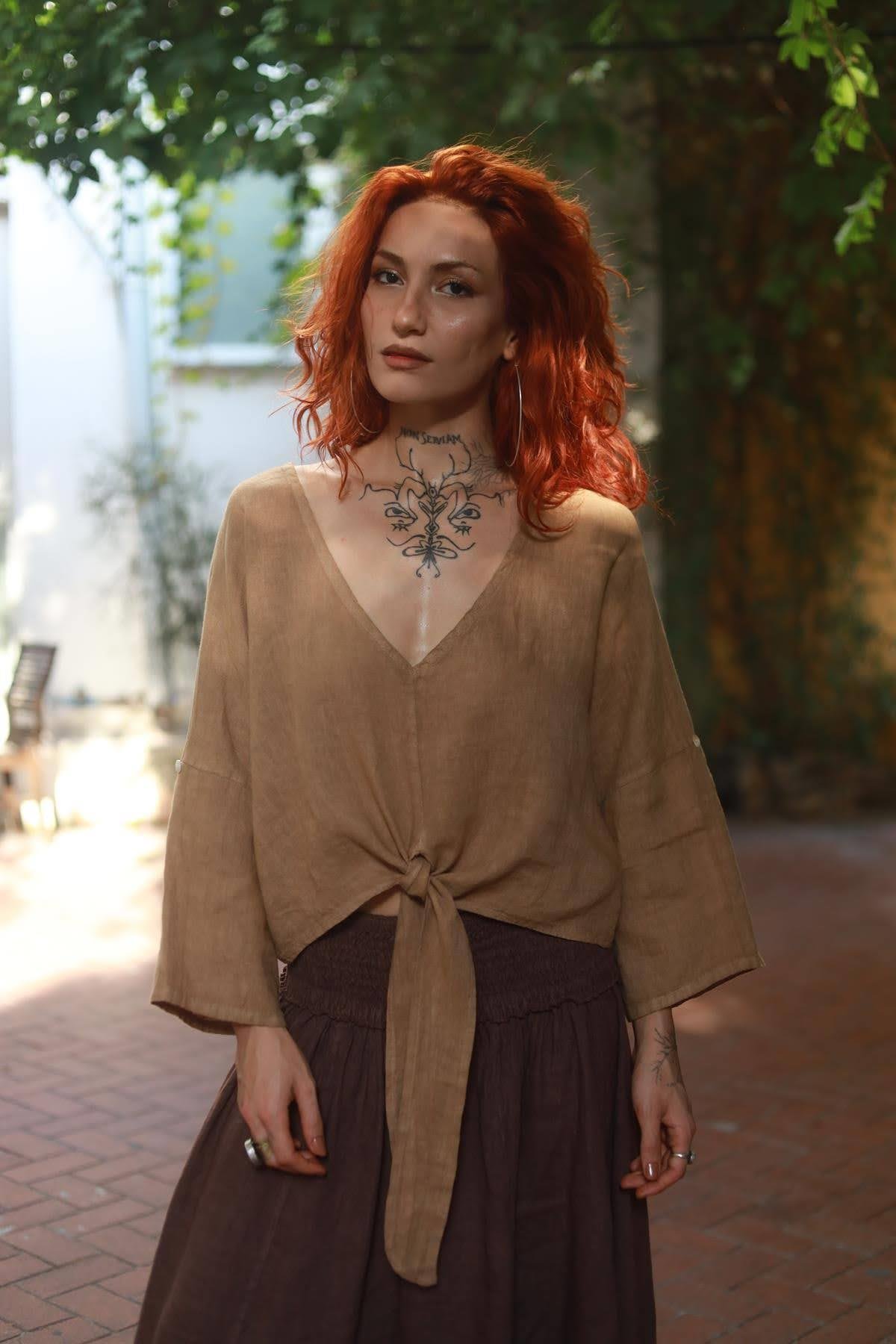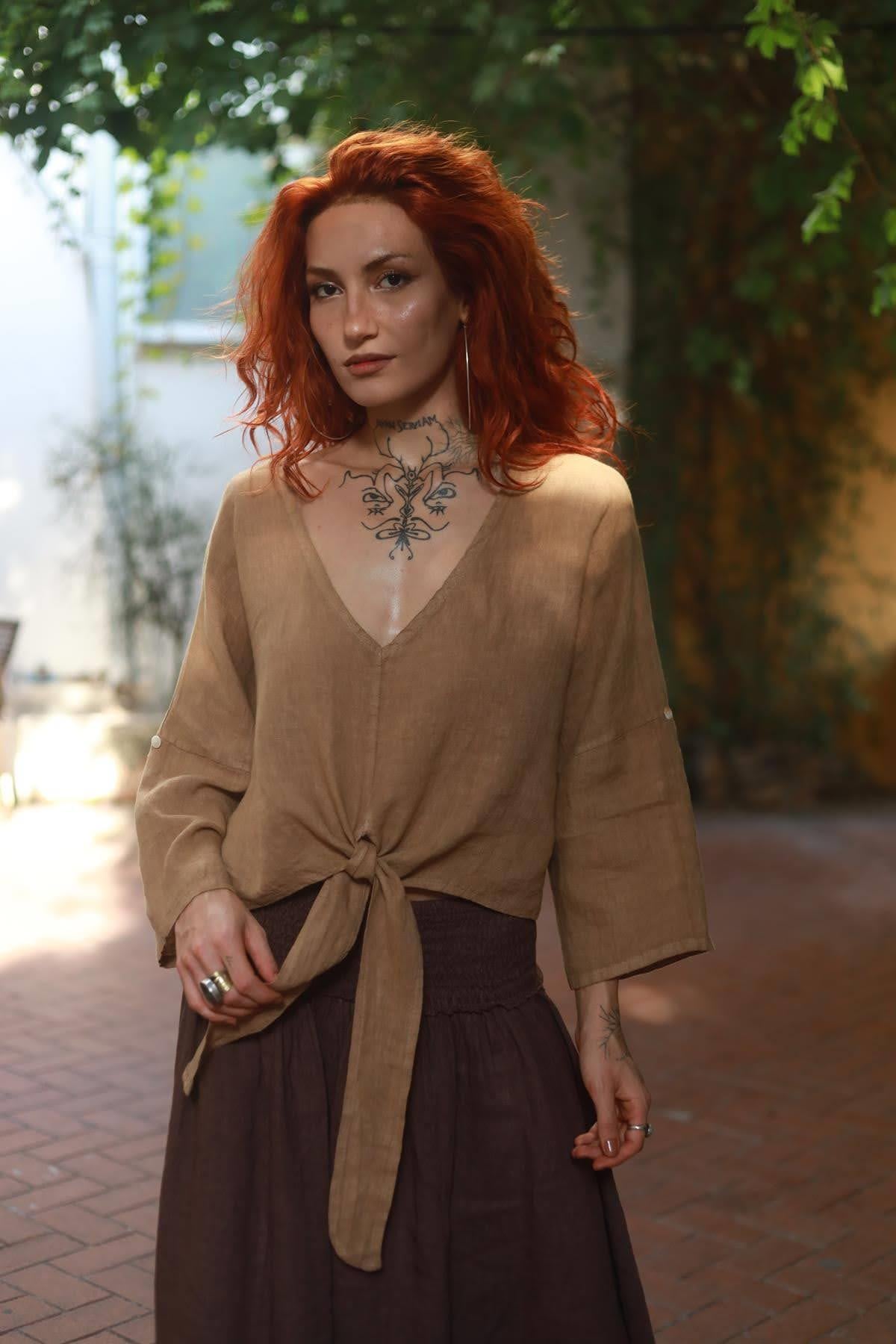 Camel Rengi Derin V Yaka Önü Bağlamalı Keten Bluz