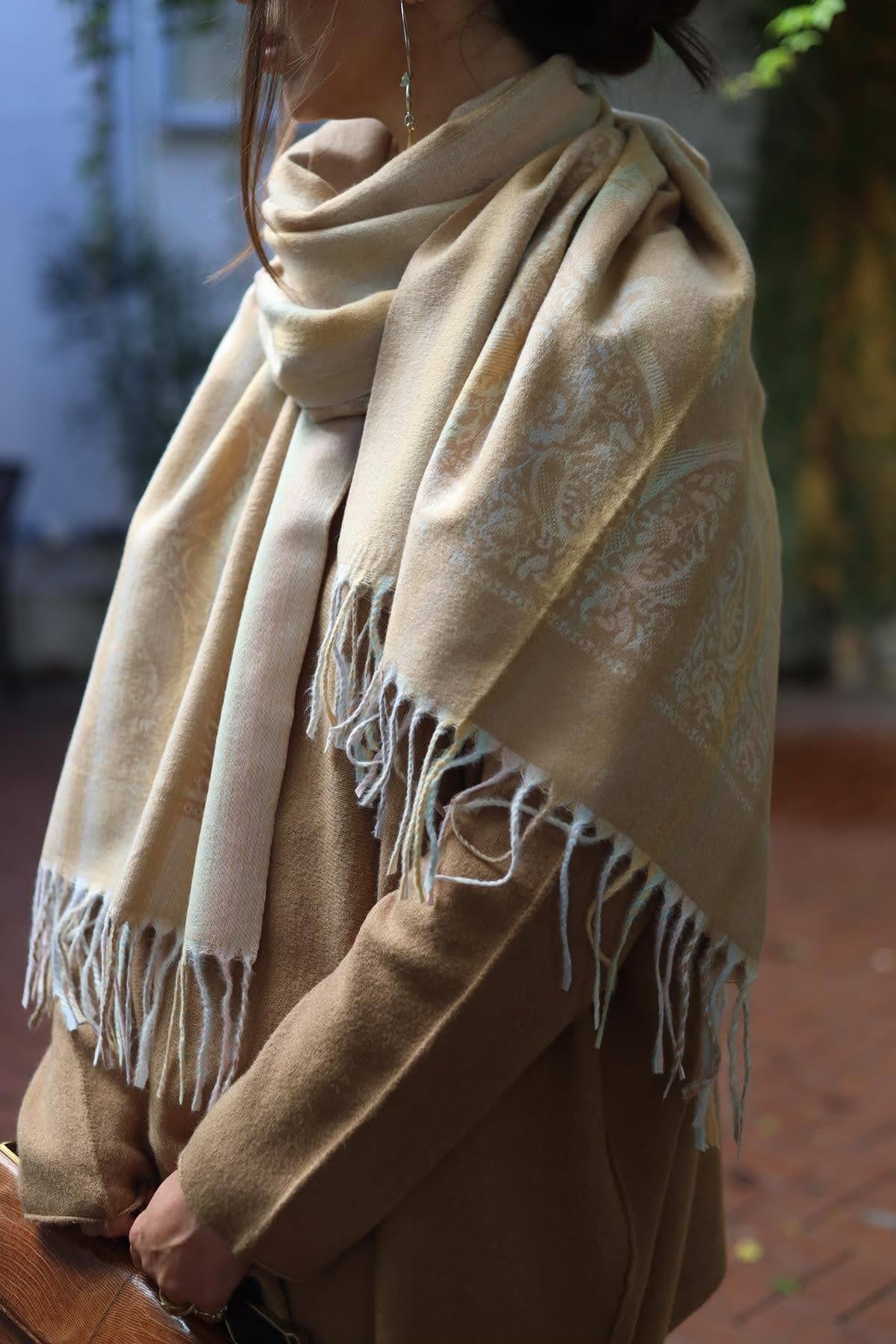 Camel Rengi Desenli Püsküllü Kaşmir Şal