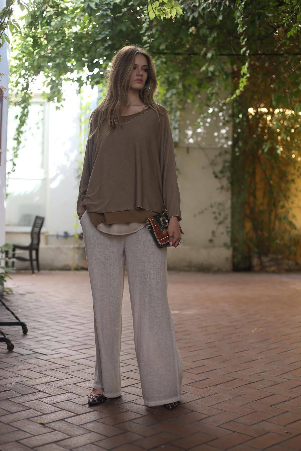 Camel Rengi Sim Detaylı Geniş Yaka Atletli Bluz (KB-PM-013-VI-CA-STD)