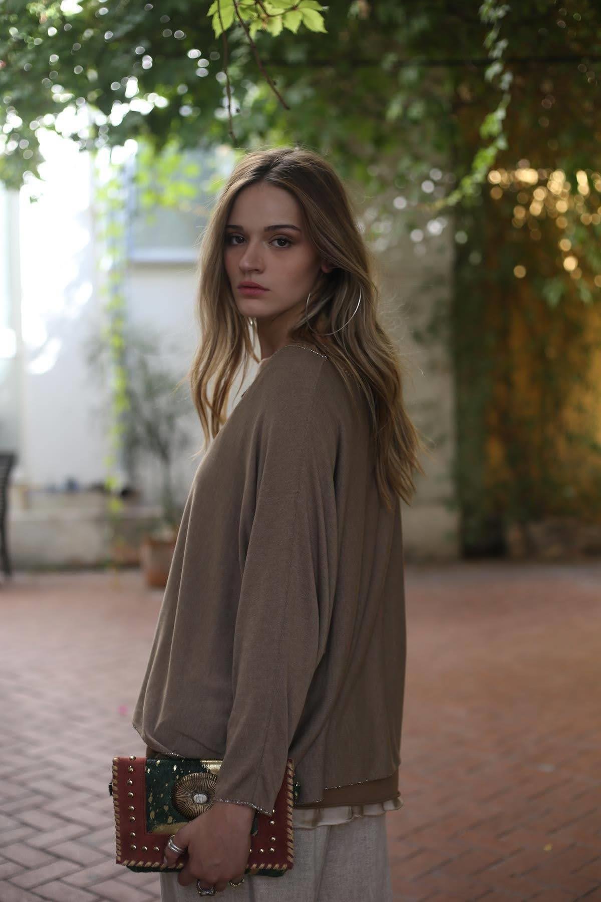 Camel Rengi Sim Detaylı Geniş Yaka Atletli Bluz