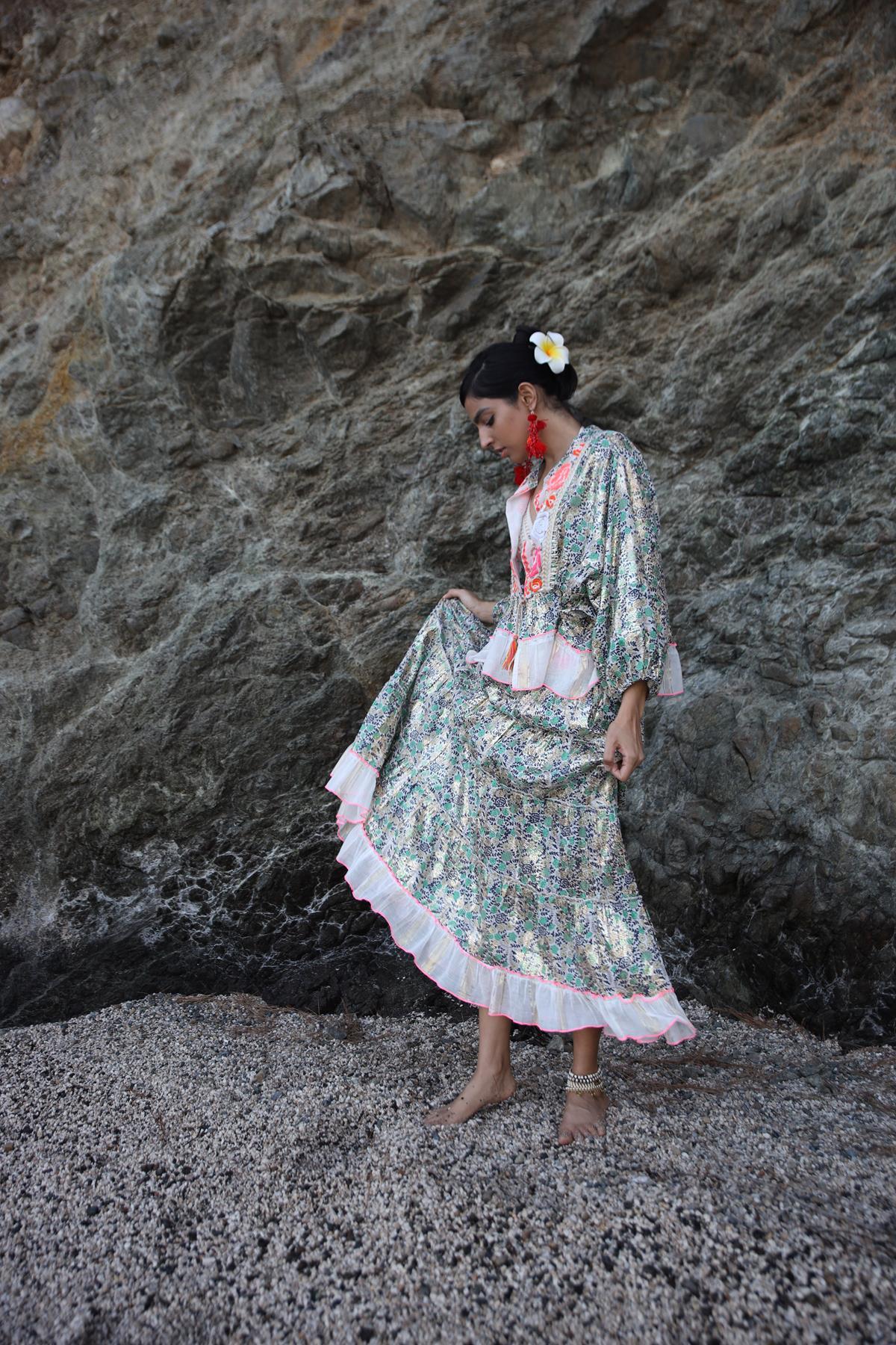 Renkli Otantik Desenli Altın Varaklı Ceket ve Etek Takım