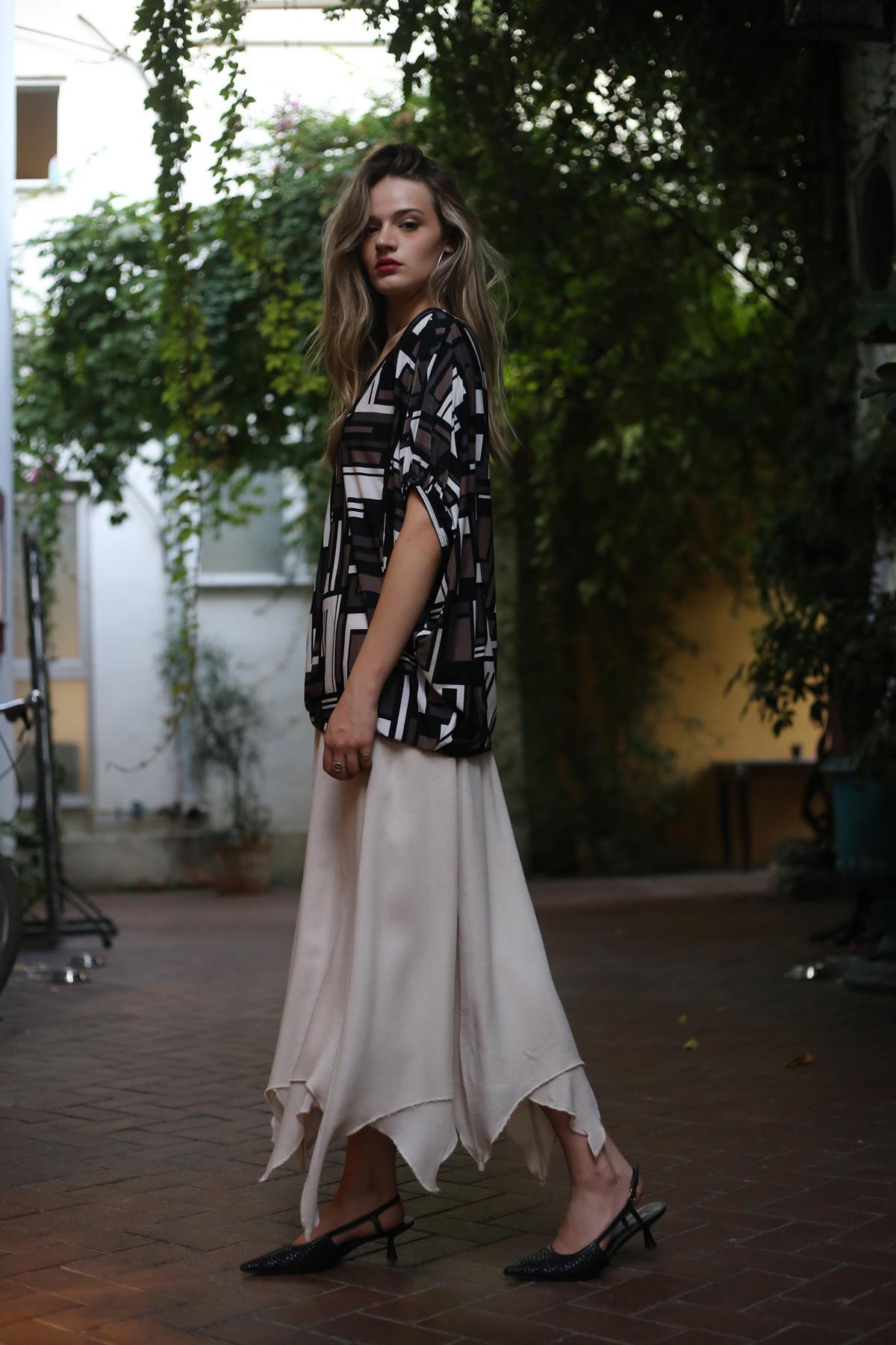 Krem Rengi Asimetrik Kesim Beli Lastikli Etek
