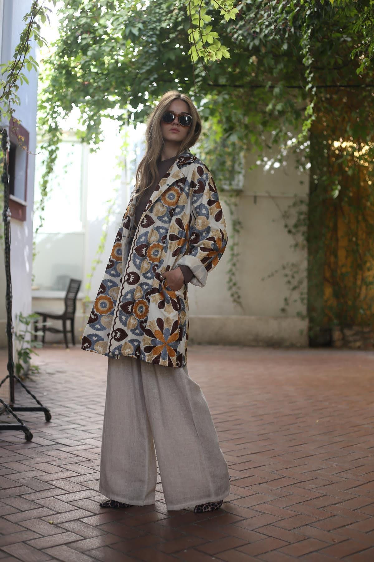 Krem Rengi Kuşaklı Kısa Suzani Kaftan