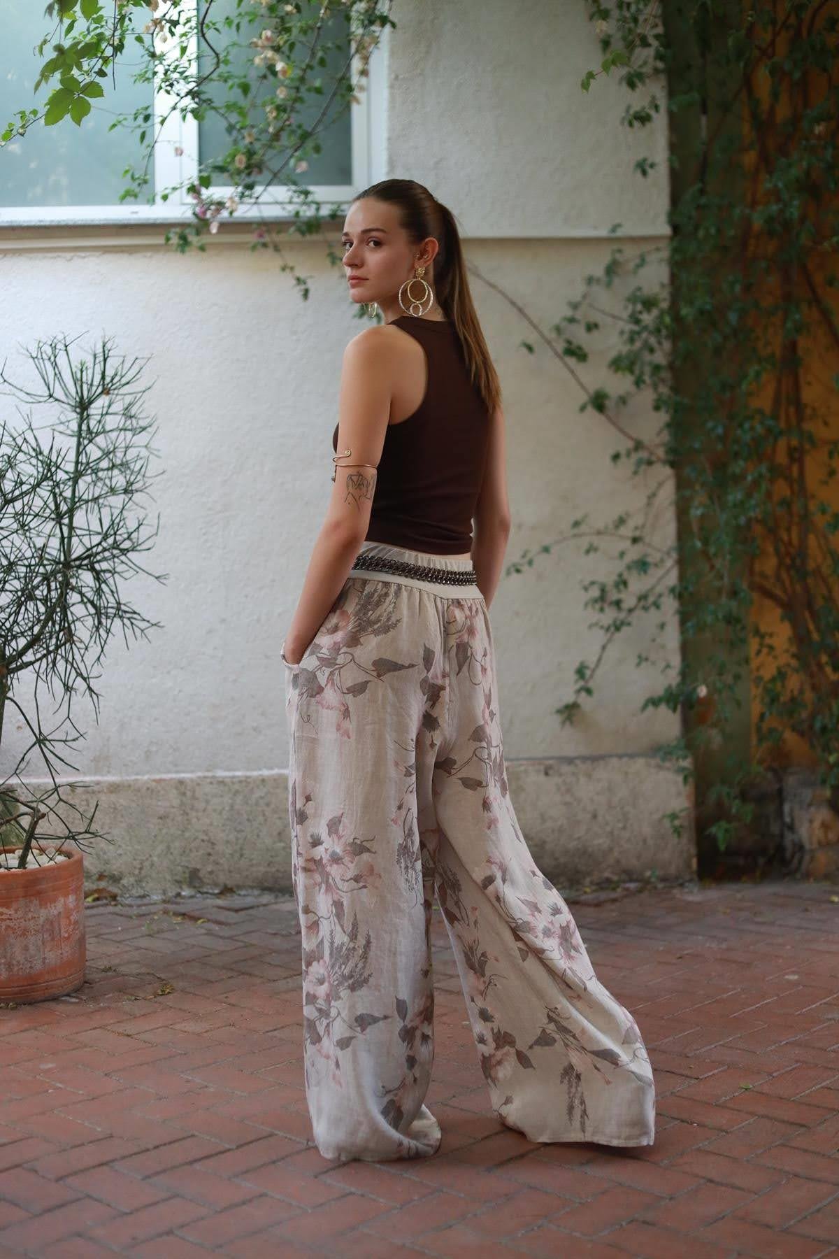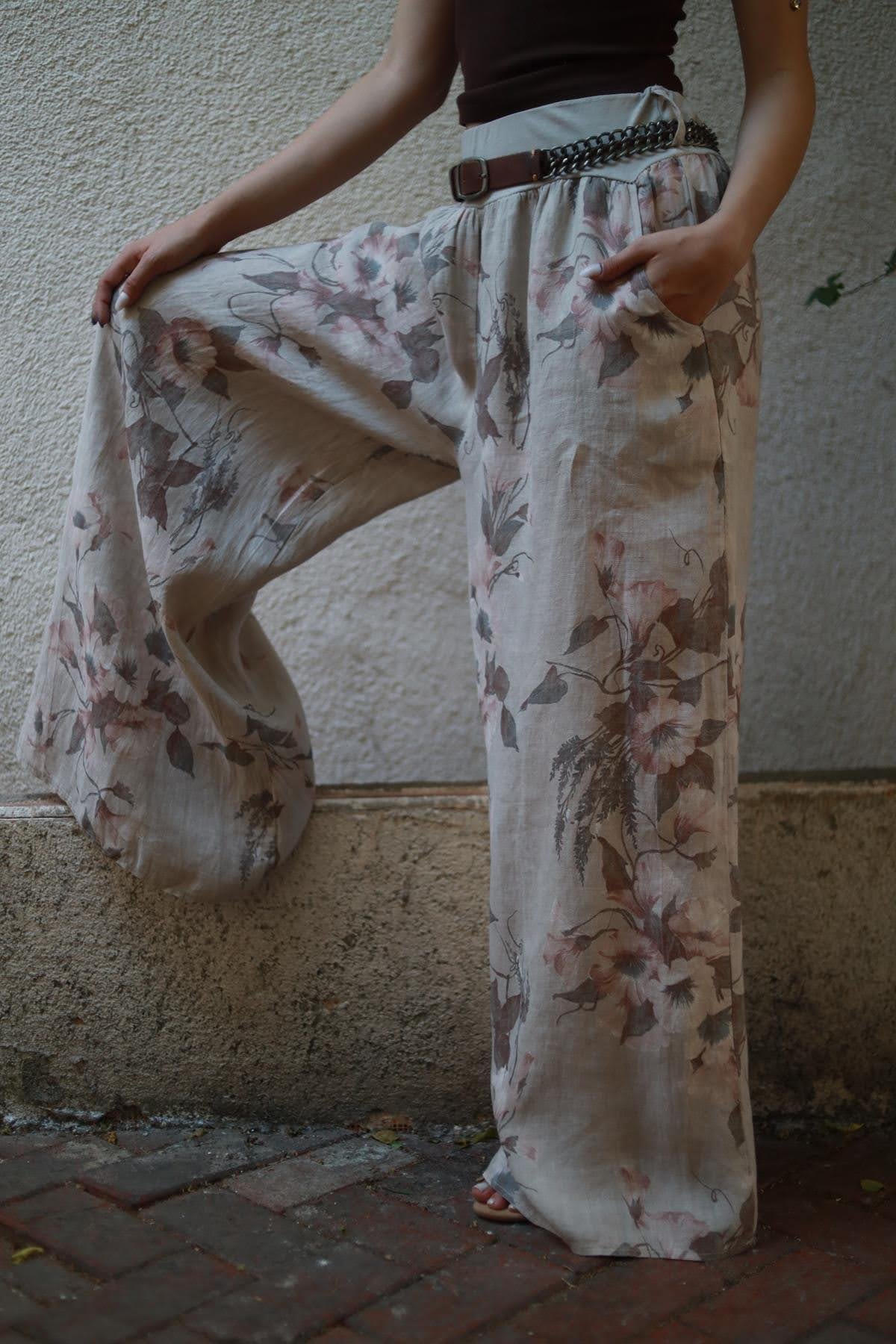 Cream Color Floral Patterned Elastic Waist Asena Pants