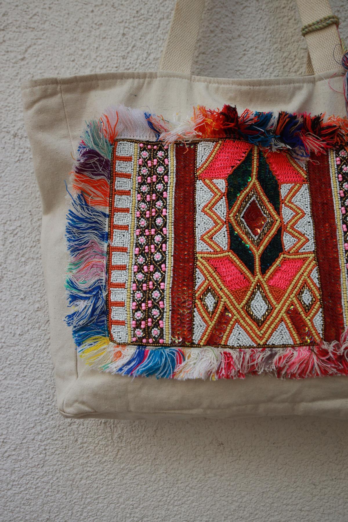 Cream Color Linen Beaded Authentic Bag
