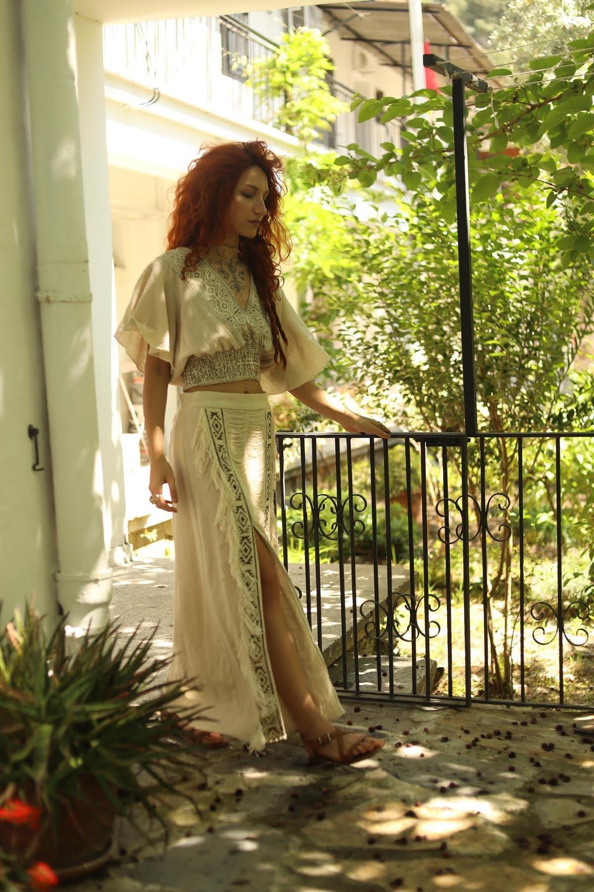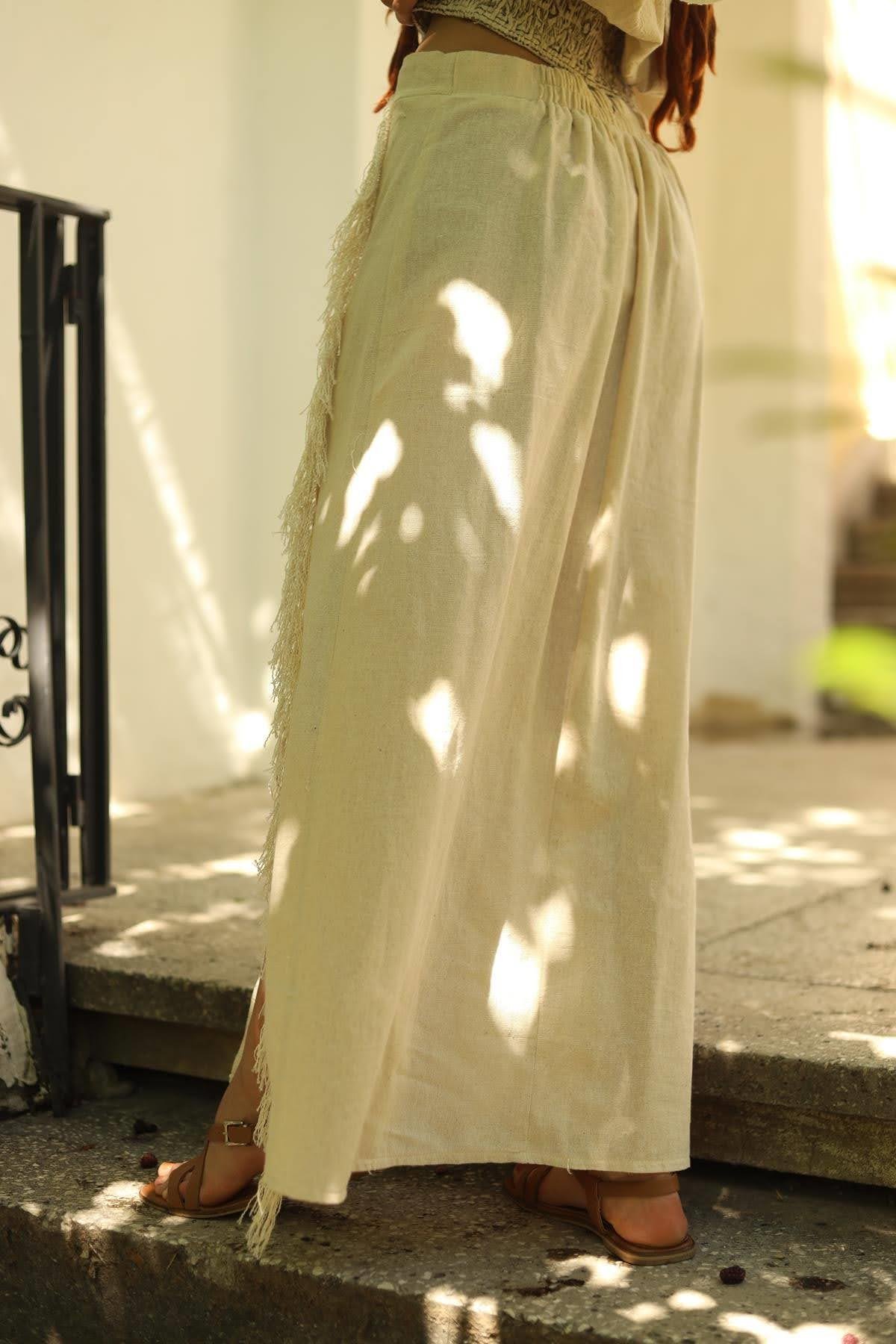 Cream Color Tasseled Slit Bohemian Skirt