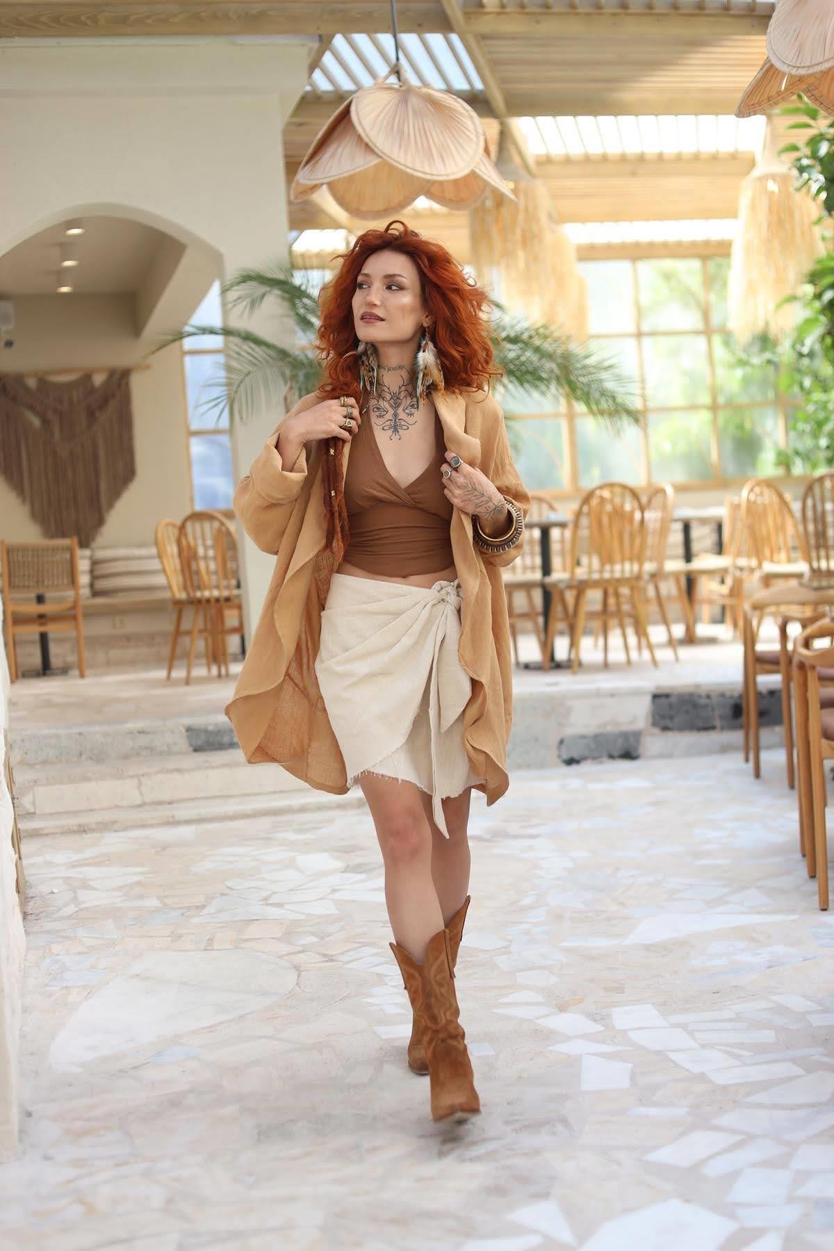 Cream Color Zippered Wrapped Short Linen Skirt