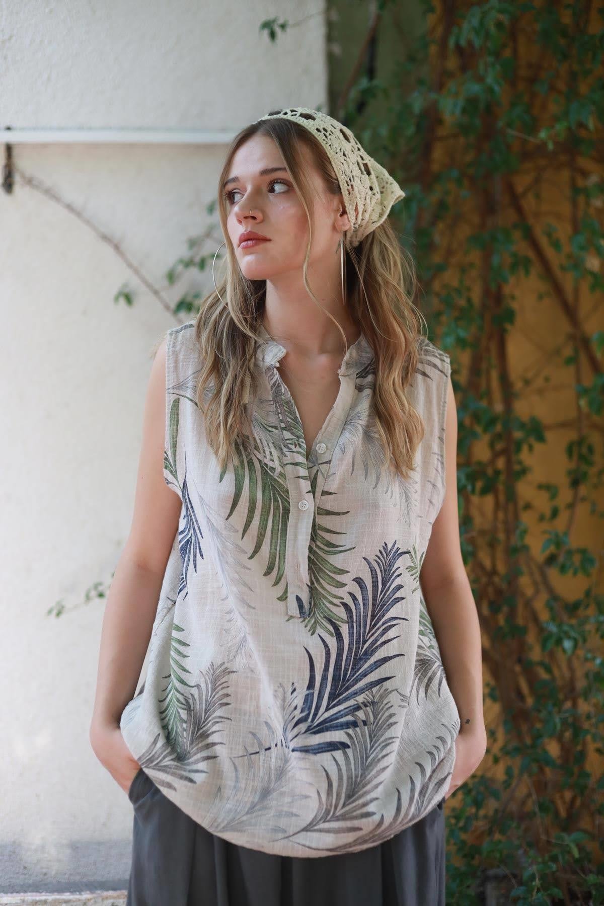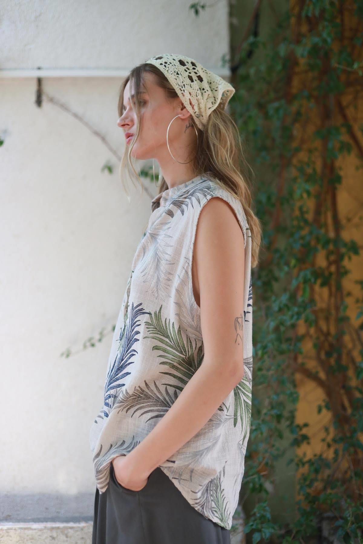 Cream Floral Patterned Three Buttoned Sleeveless Shirt