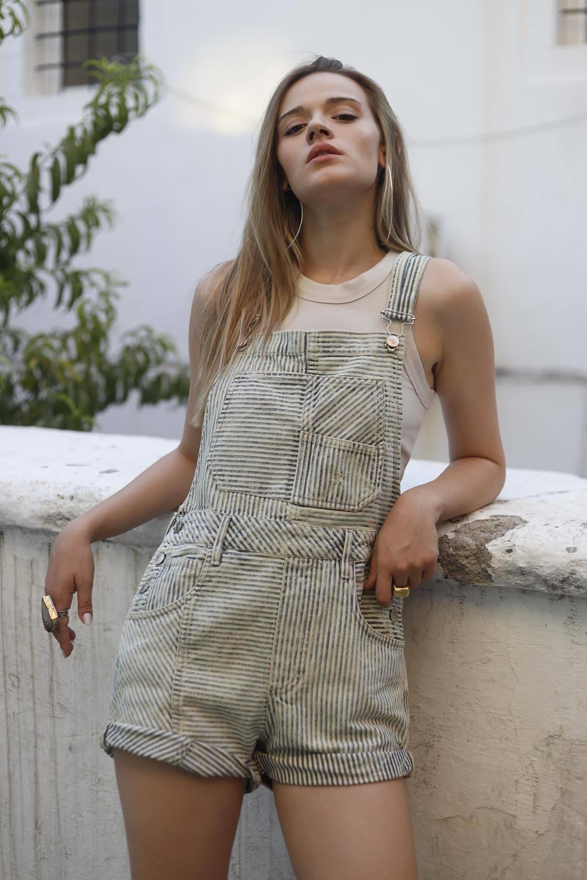 Ecru Asymmetric Striped Short Denim Jumpsuit