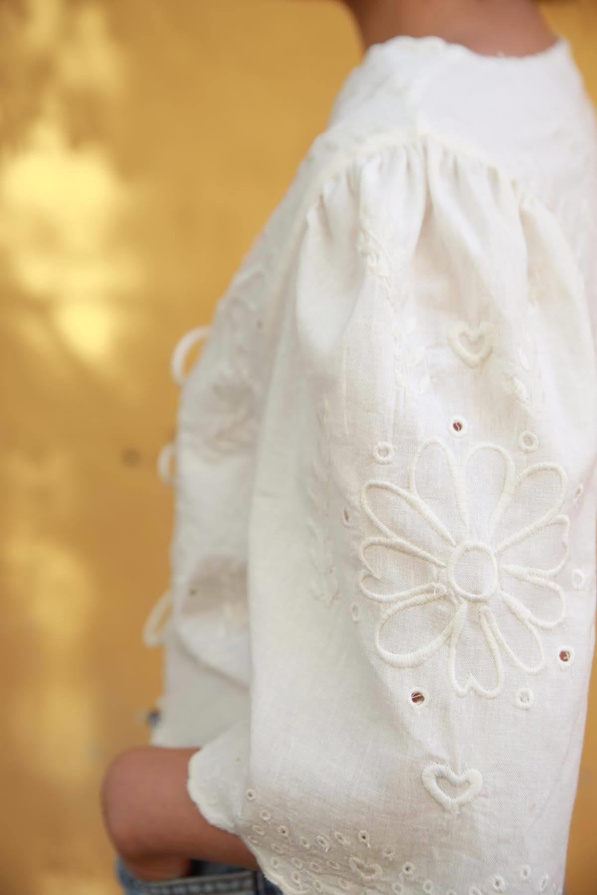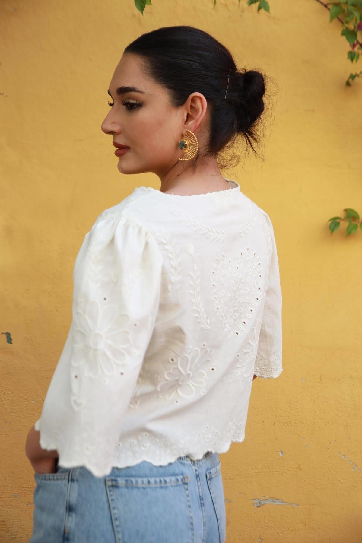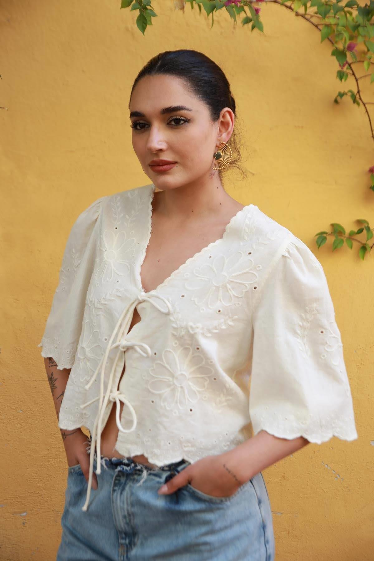 Ecru Embroidered Front Tie Blouse