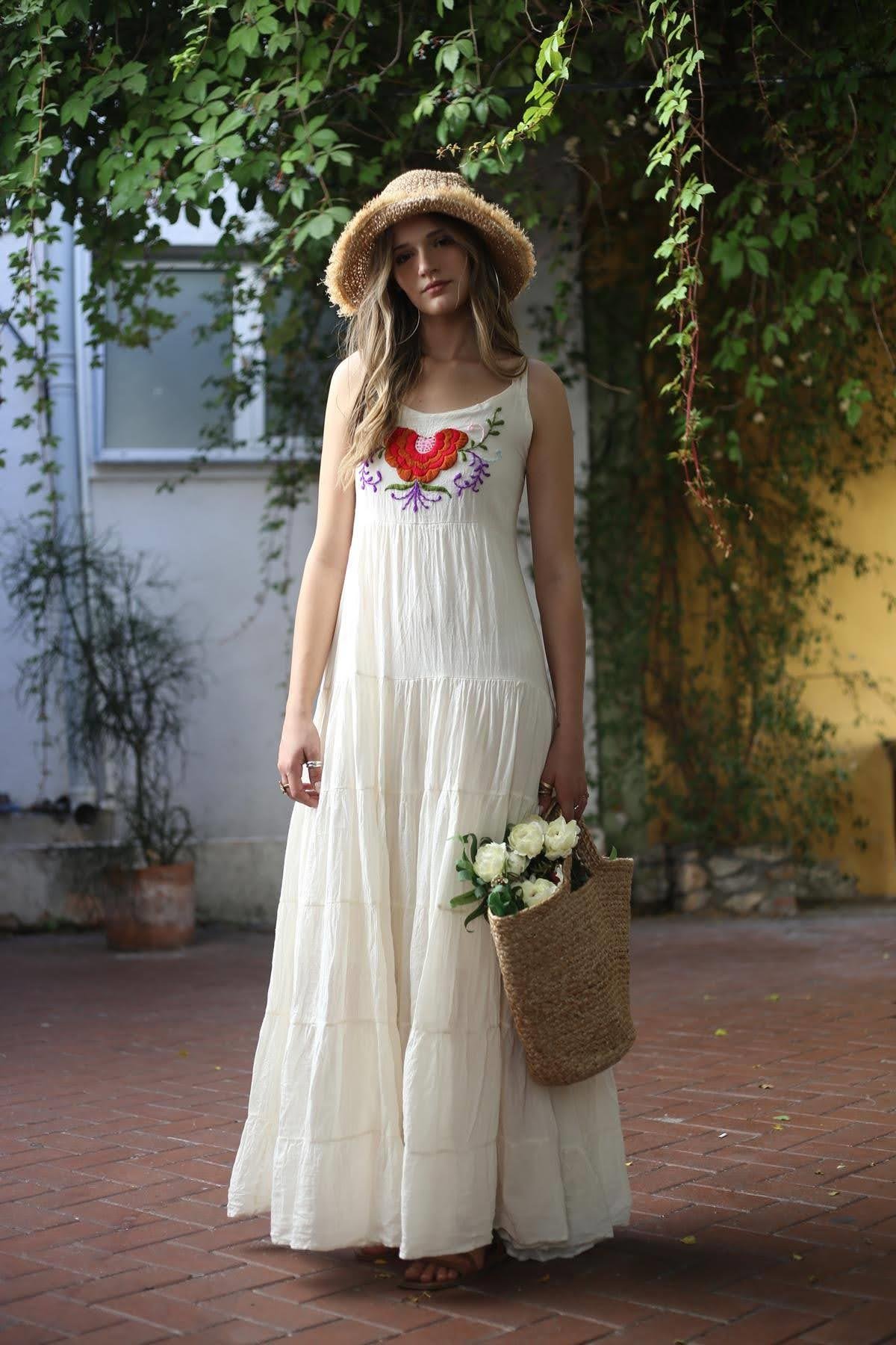 Ecru Embroidered Strappy Bohemian Dress