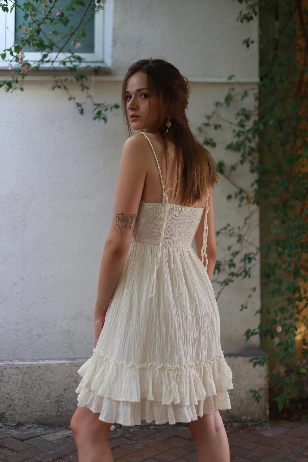 Ekru Göğsü Büzgülü Askılı Kısa Elbise (KE-RMR-099-PA-EK-STD)