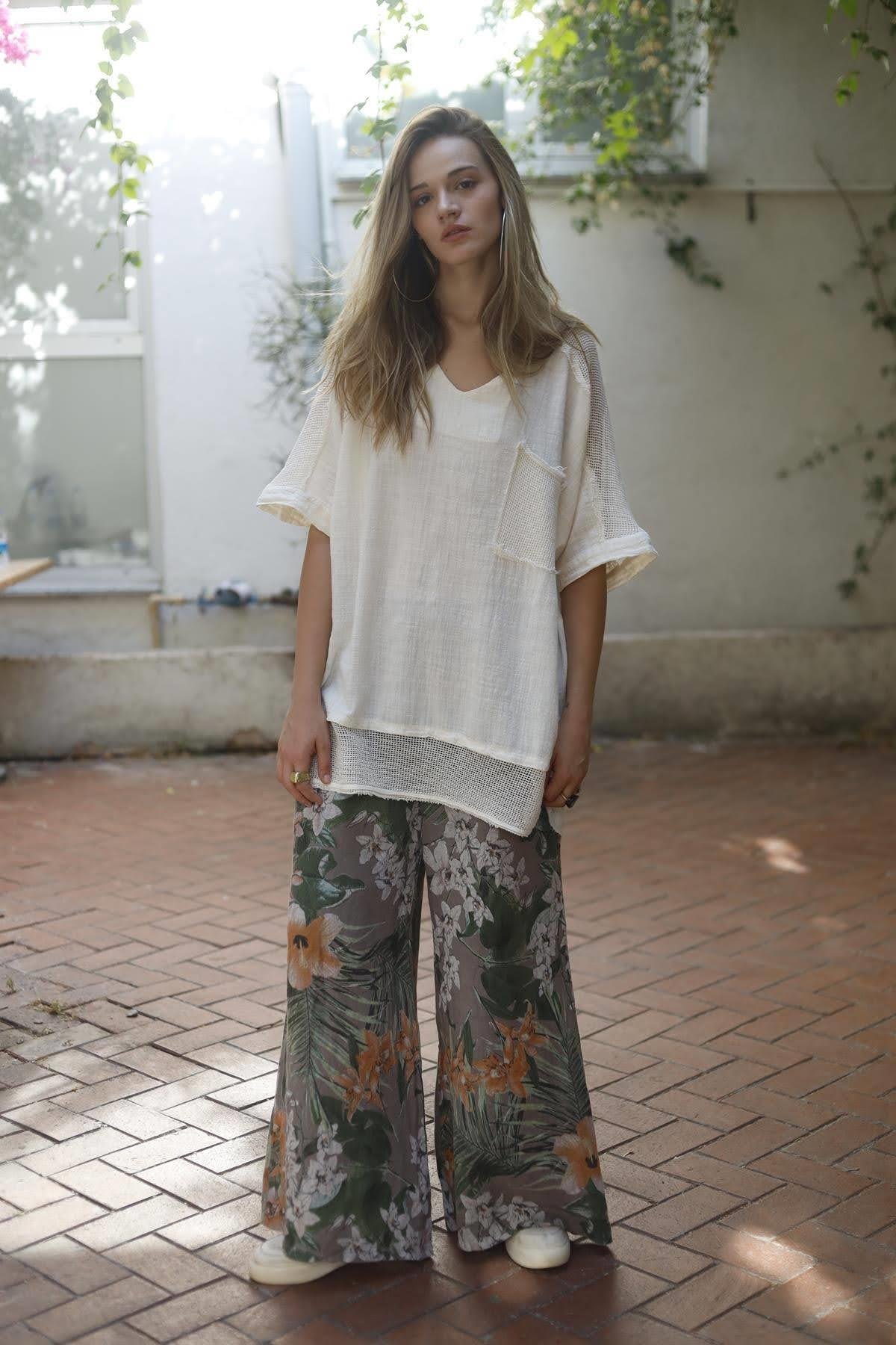 Ekru Kesik Yaka Püsküllü File Detaylı Bluz