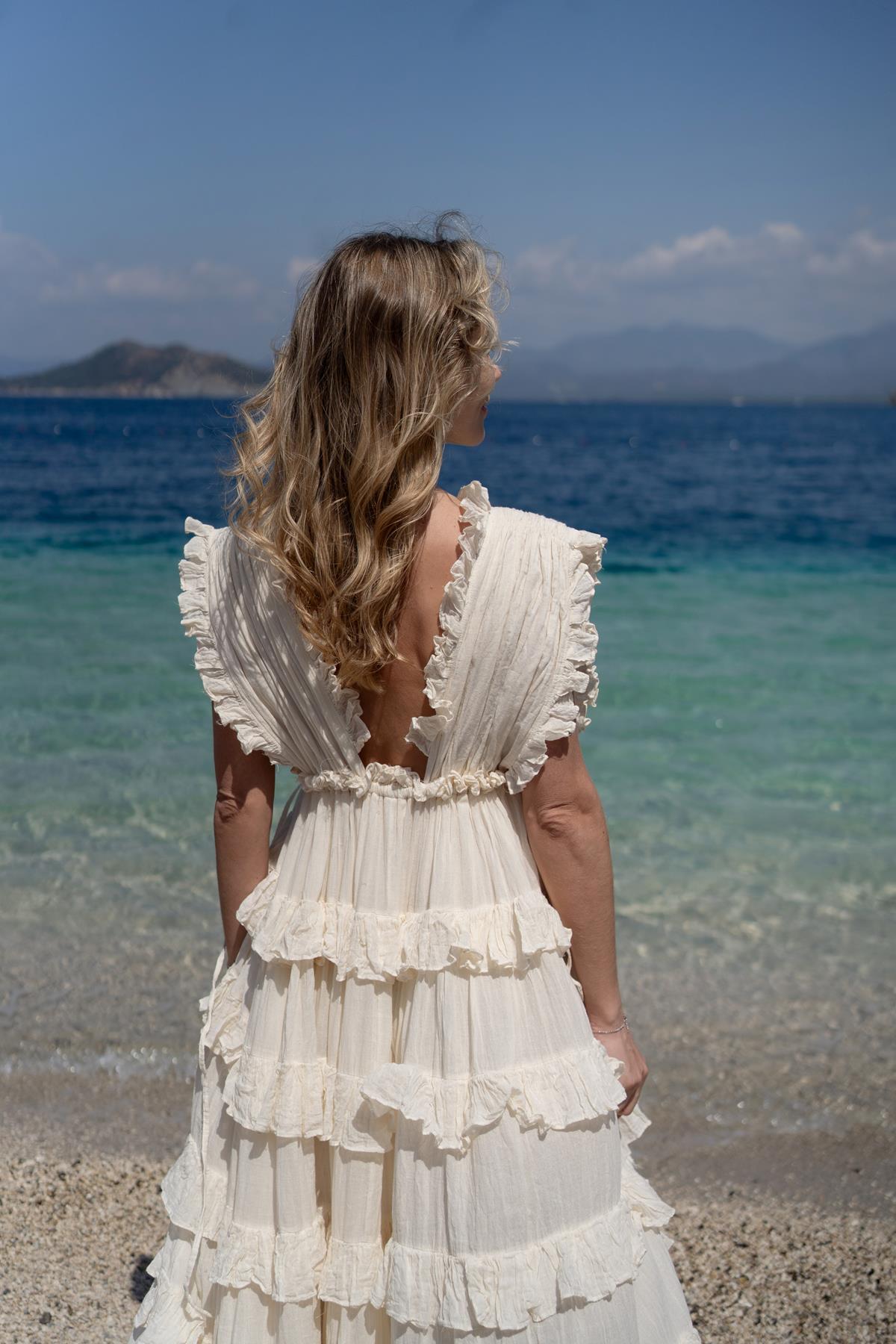 Ekru Lastikli Kalın Askılı Volanlı Bohem Elbise (KE-RMR-034-PA-EK-STD)