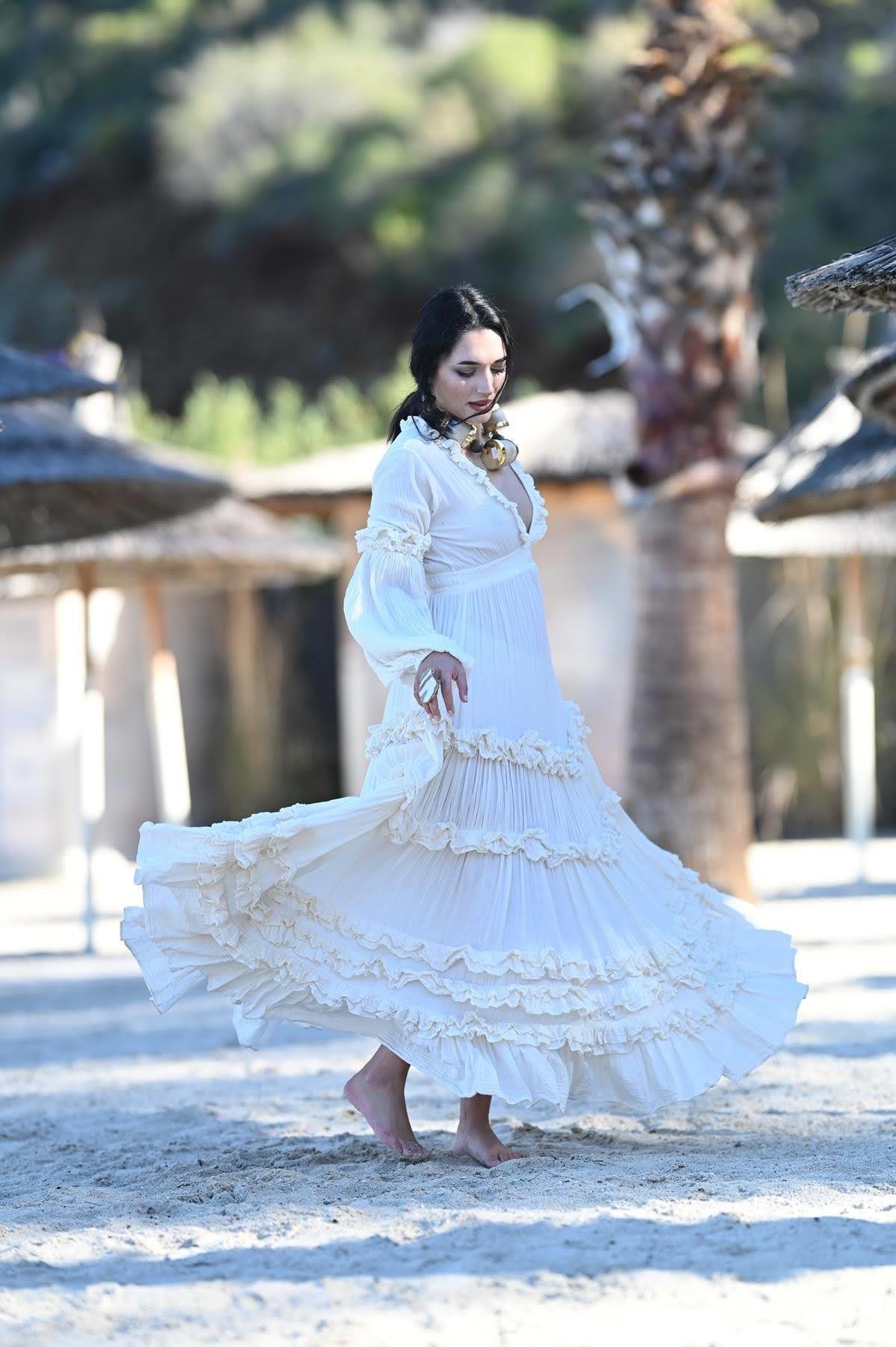 Ekru Volanlı V Yaka Balon Kol Elbise