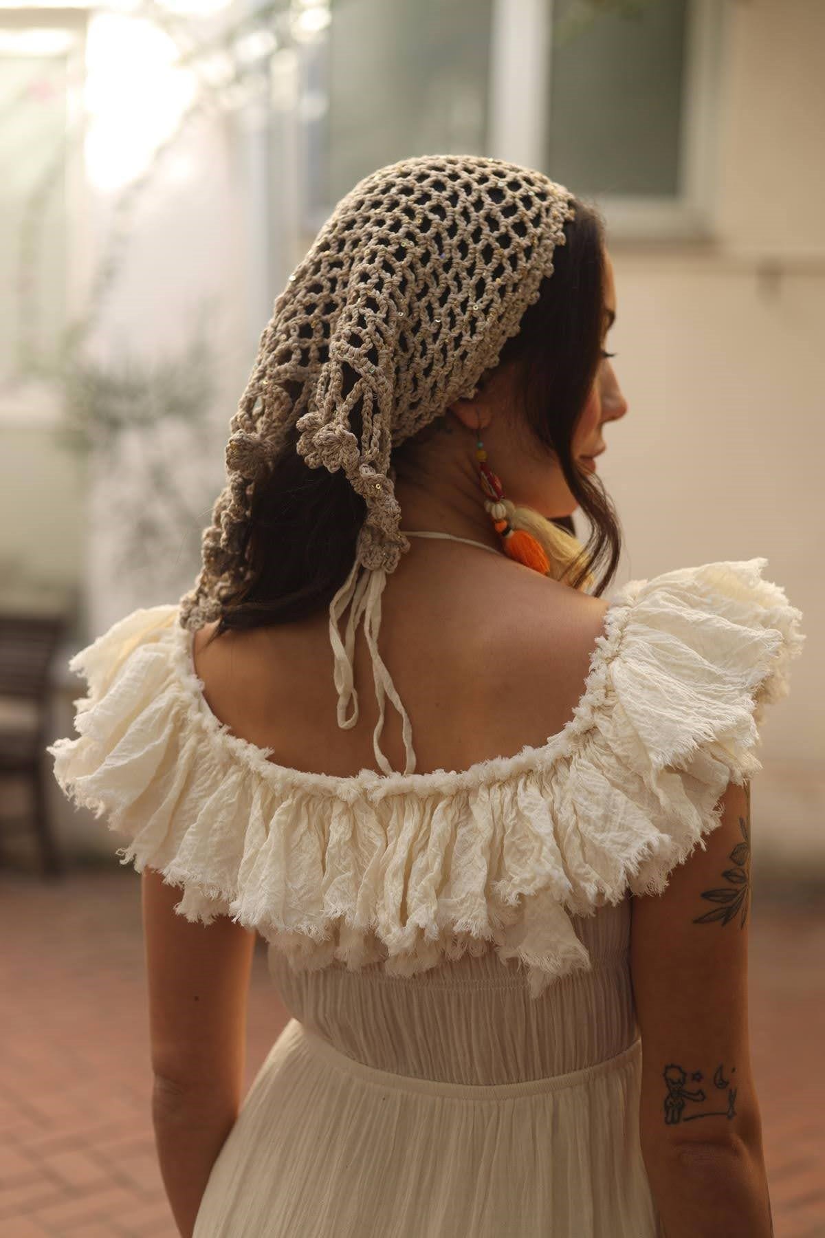 Ekru Yakası Volanlı Bağlamalı Bohem Elbise