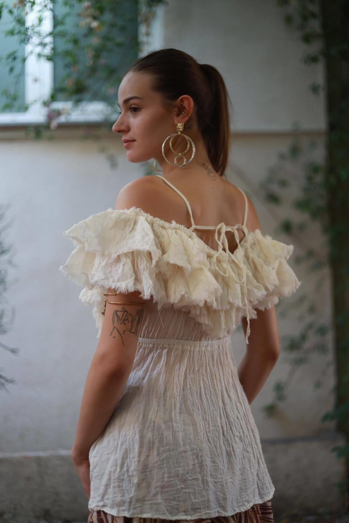 Ekru Yakası Volanlı Brit Detaylı Bluz