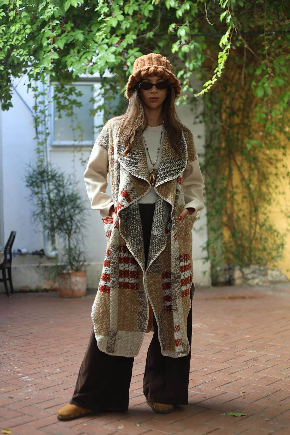 -Krem Rengi Ekose Parça Detaylı Keçe Kaban (KKBN-CMN-001-PO-KR-STD)