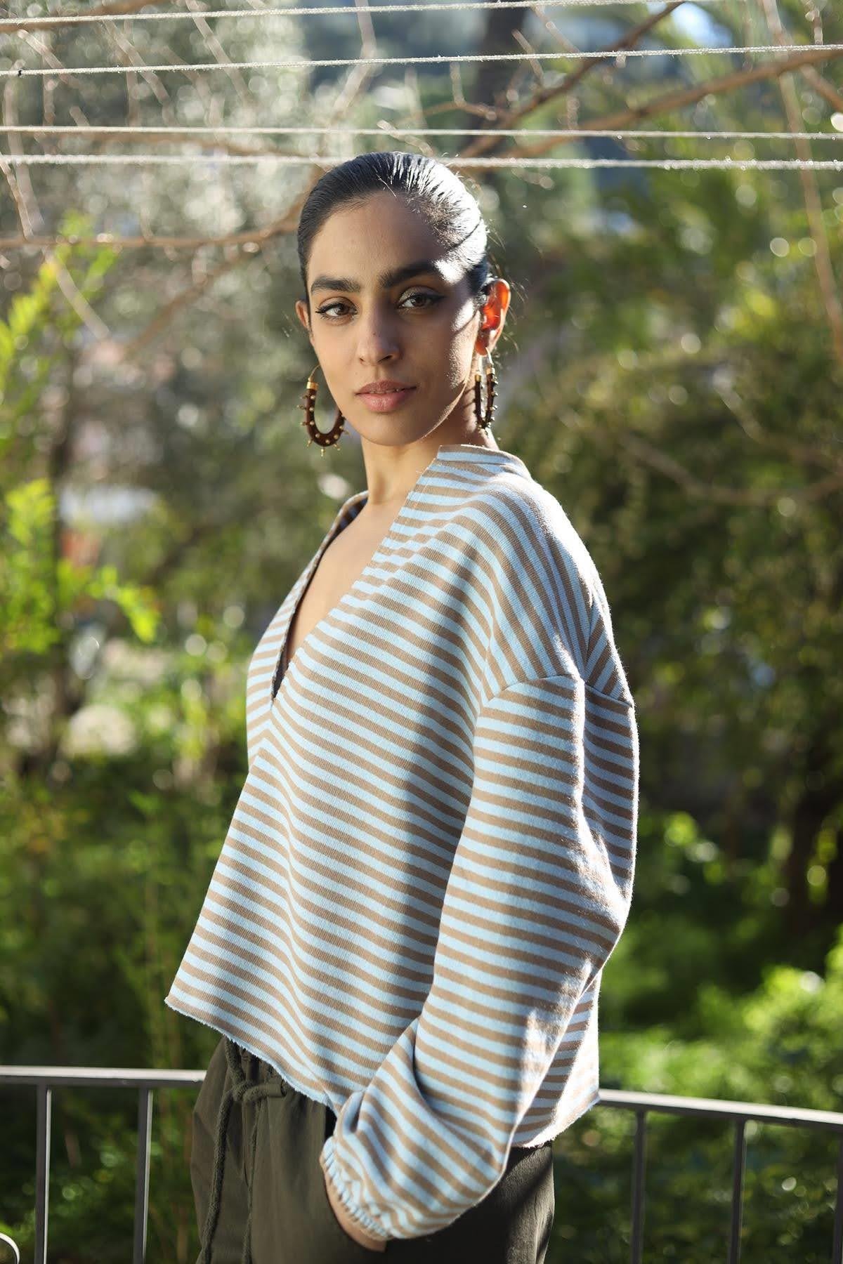 Açık Mavi Derin V Yaka Çizgili Bluz (KB-SIT-012-PA-AMA-STD)