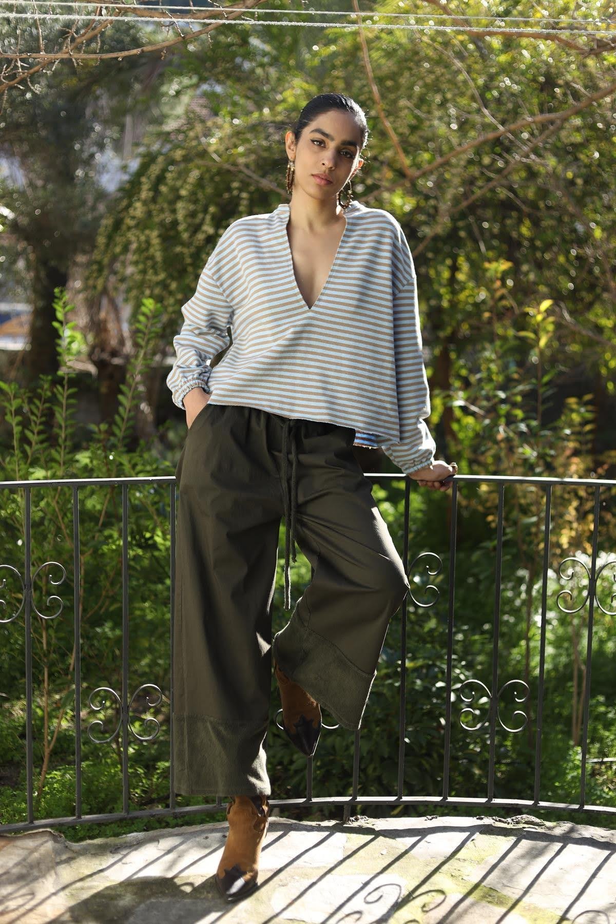Açık Mavi Derin V Yaka Çizgili Bluz