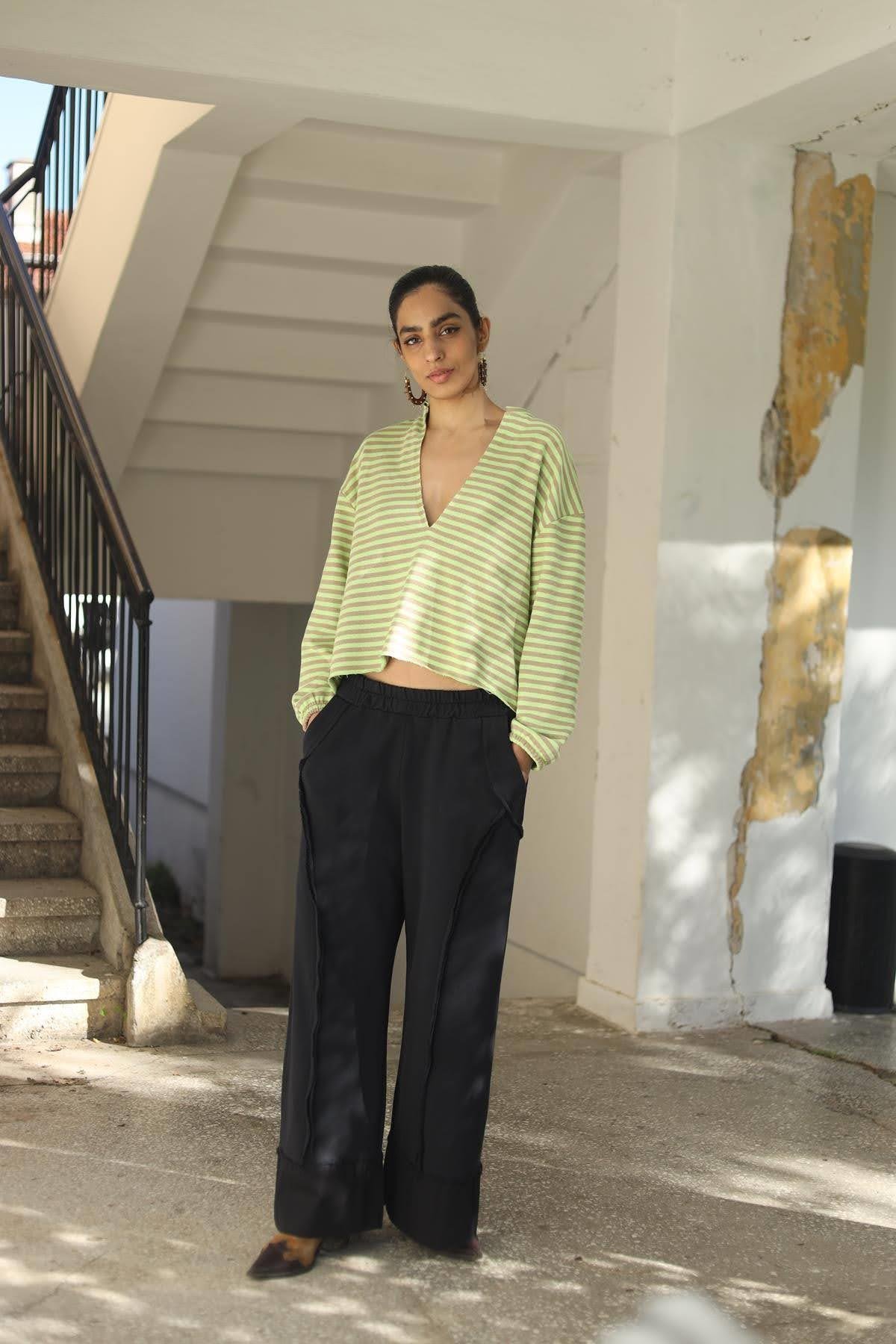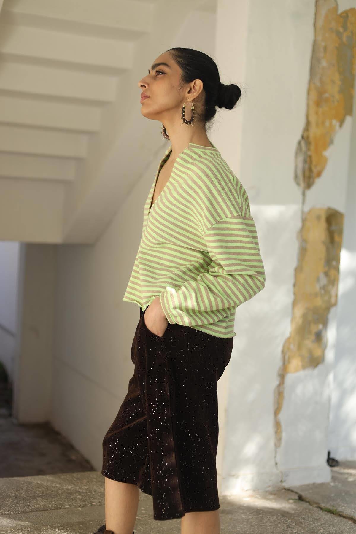 Açık Yeşil Derin V Yaka Çizgili Bluz (KB-SIT-012-PA-AYE-STD)