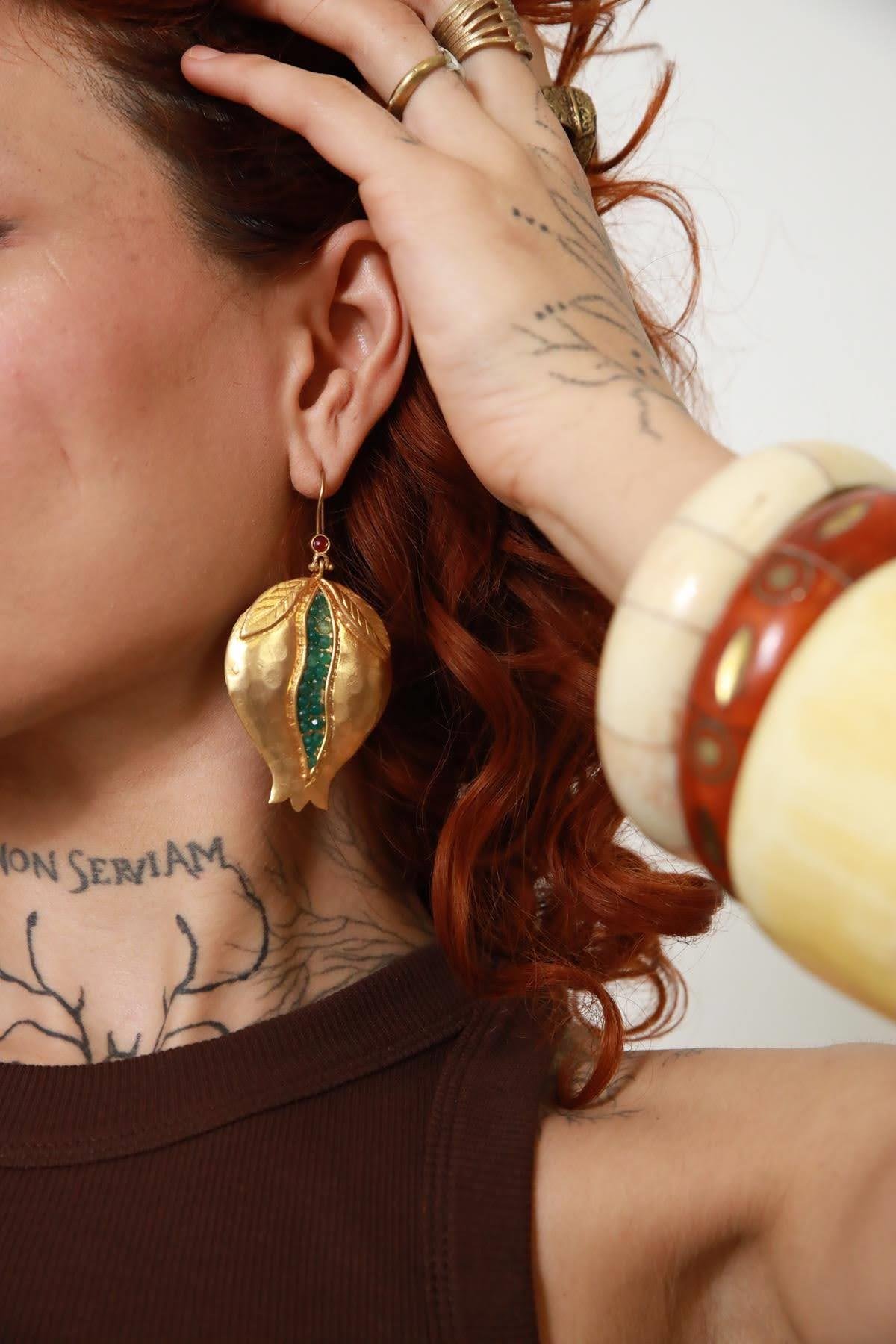 Altın Kaplama Bronz El Yapımı Yeşil Taşlı Küpe